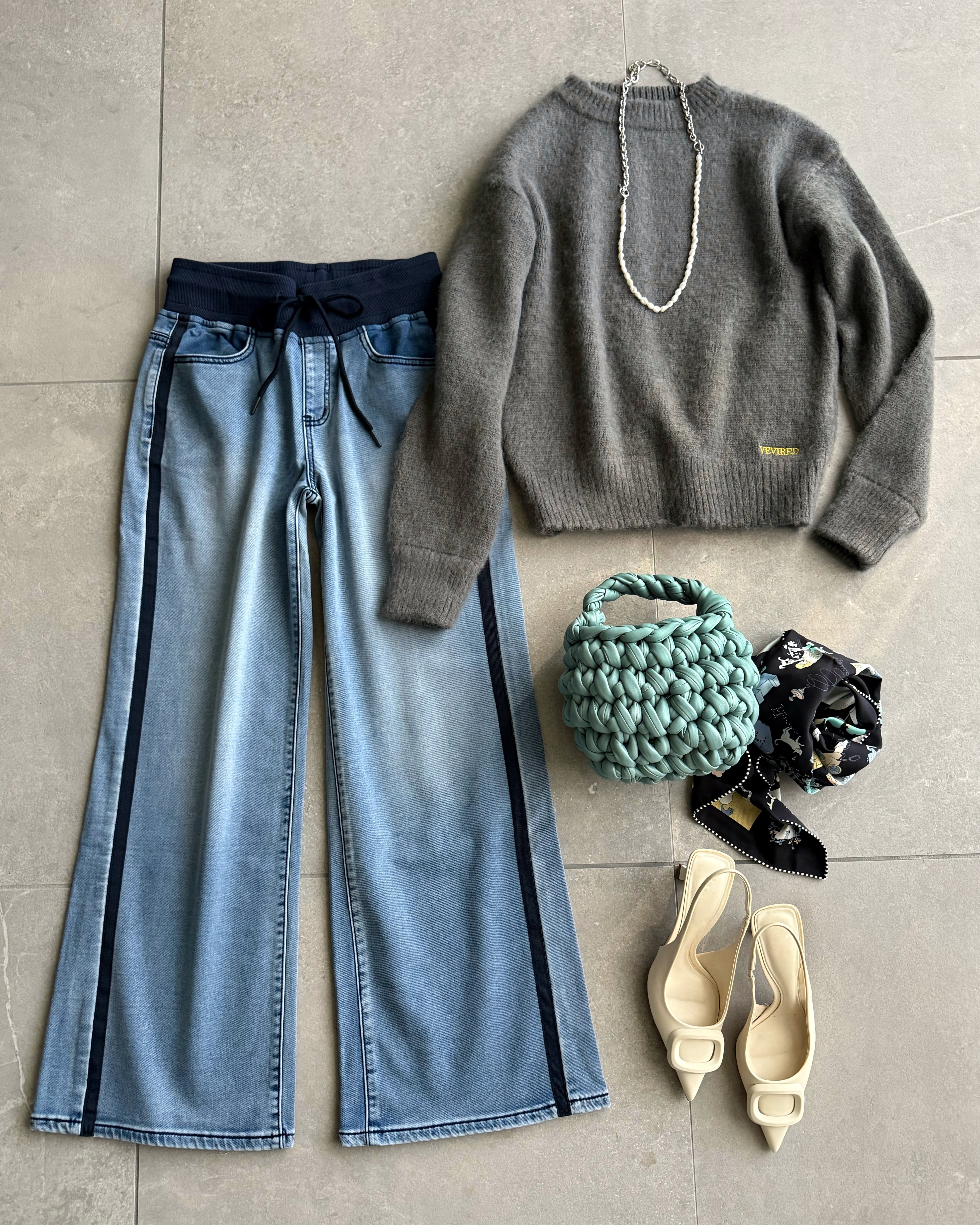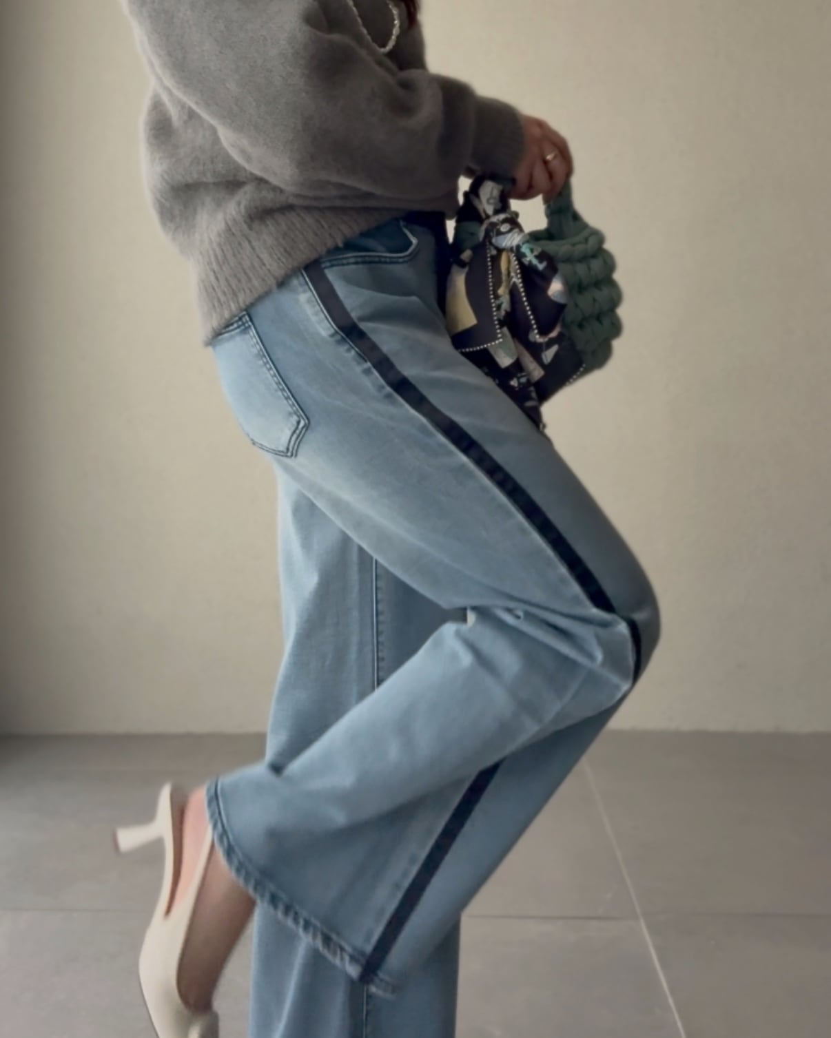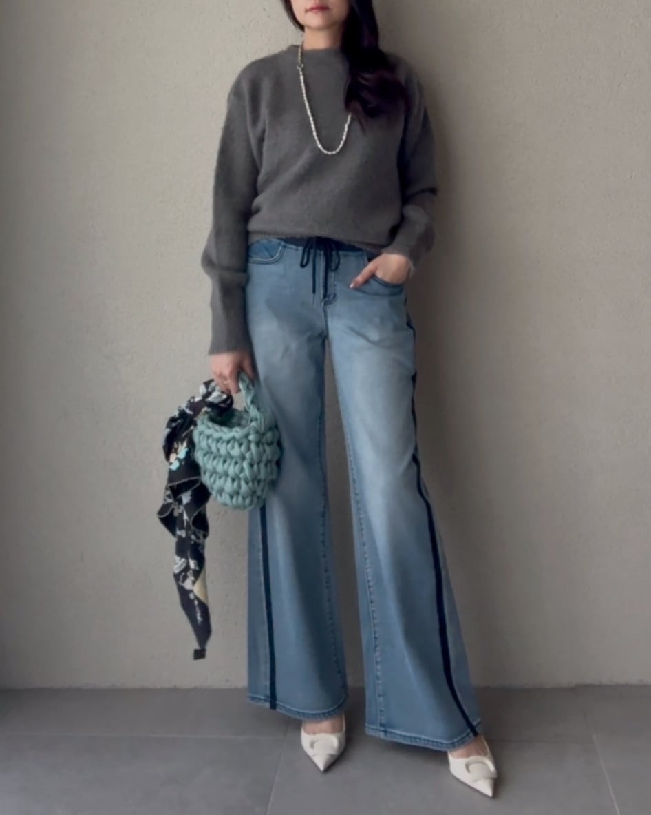アクセントになったデニムワイドパンツ。