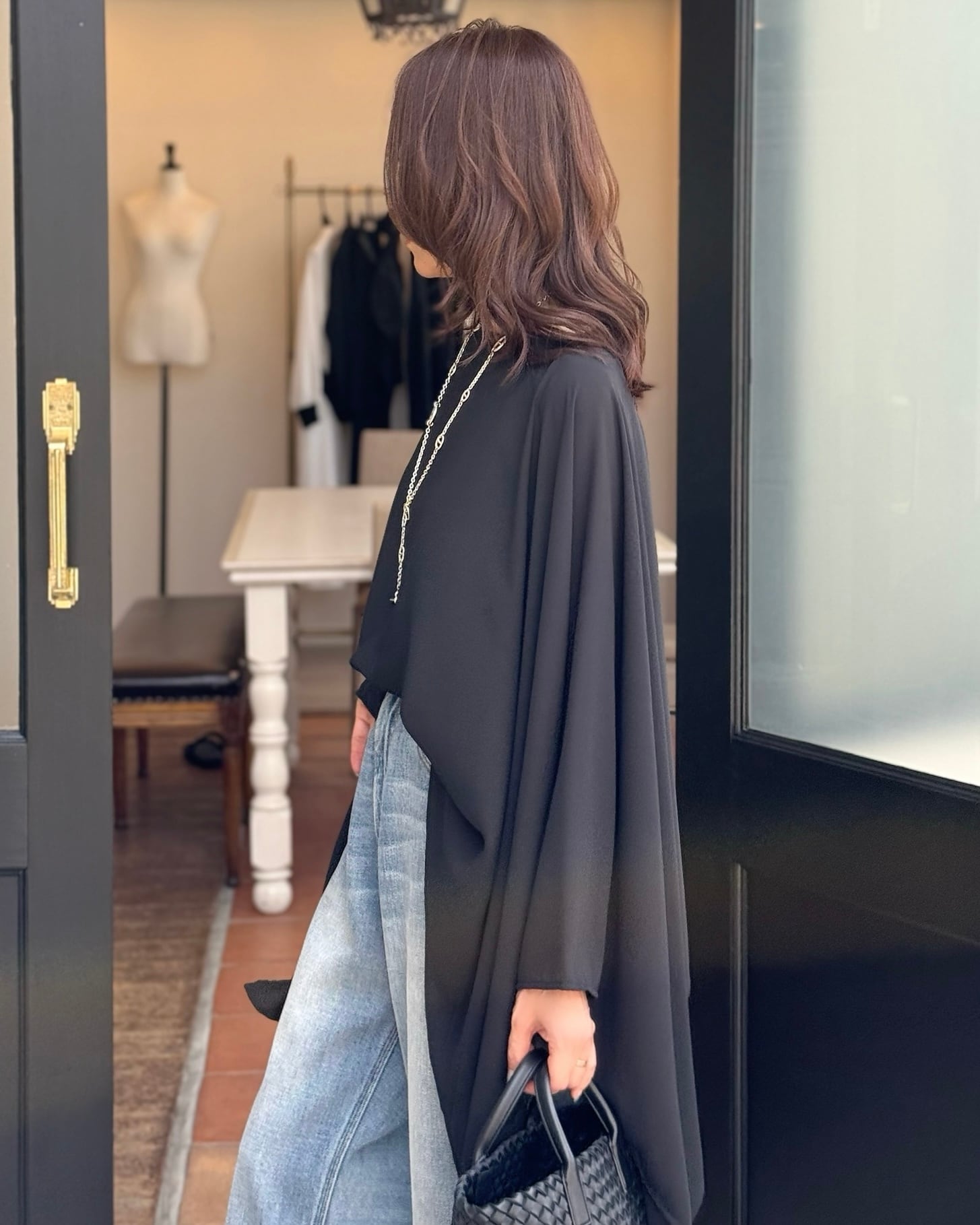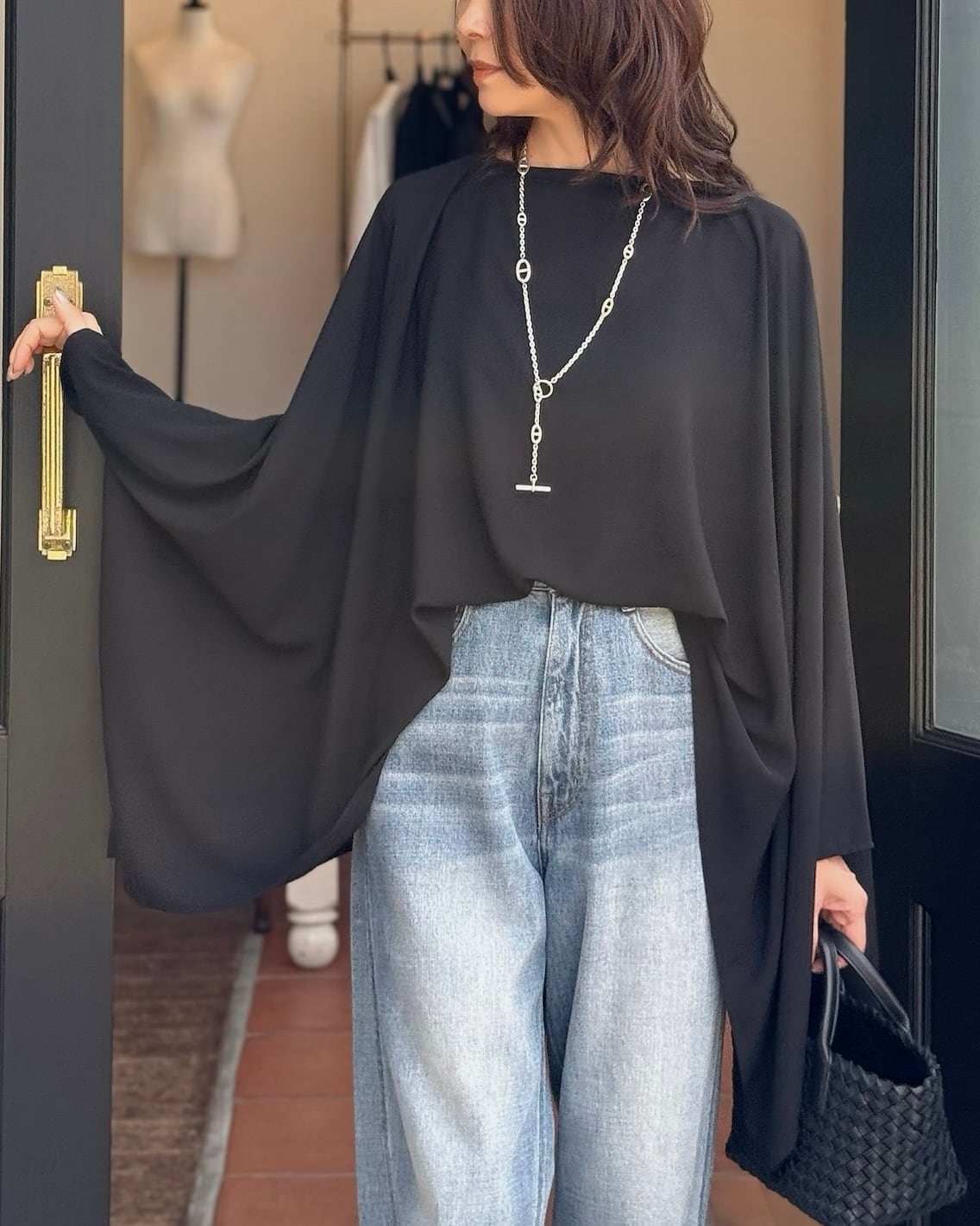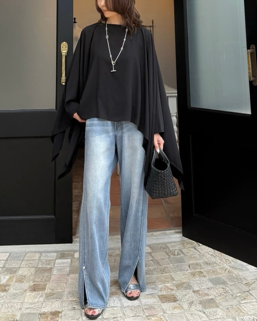シンプルなデザインながらドレープ感を最大限に活かした存在感のあるポンチョは幅広いシーンで活躍する便利なアイテムです。