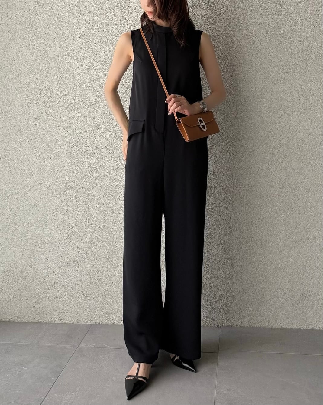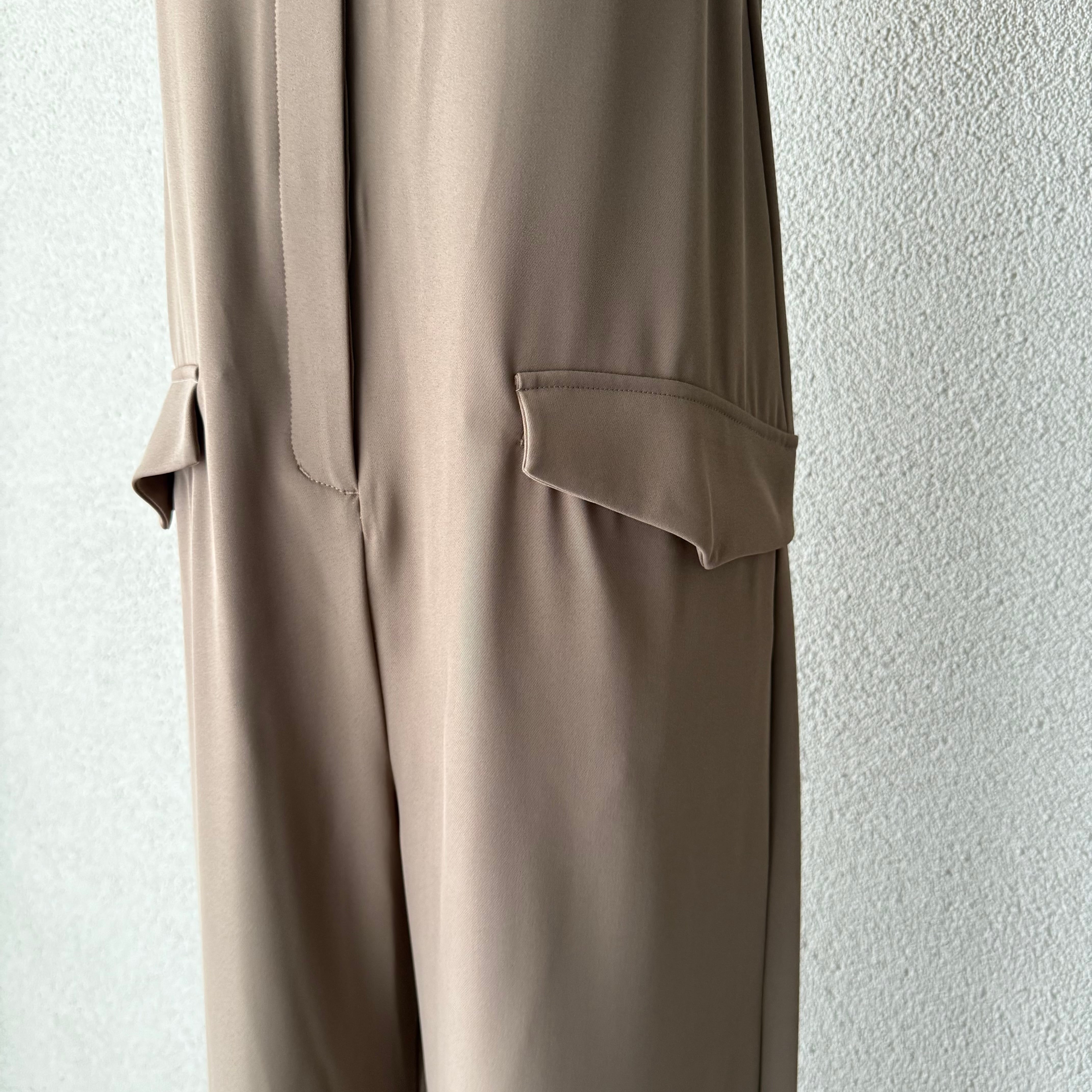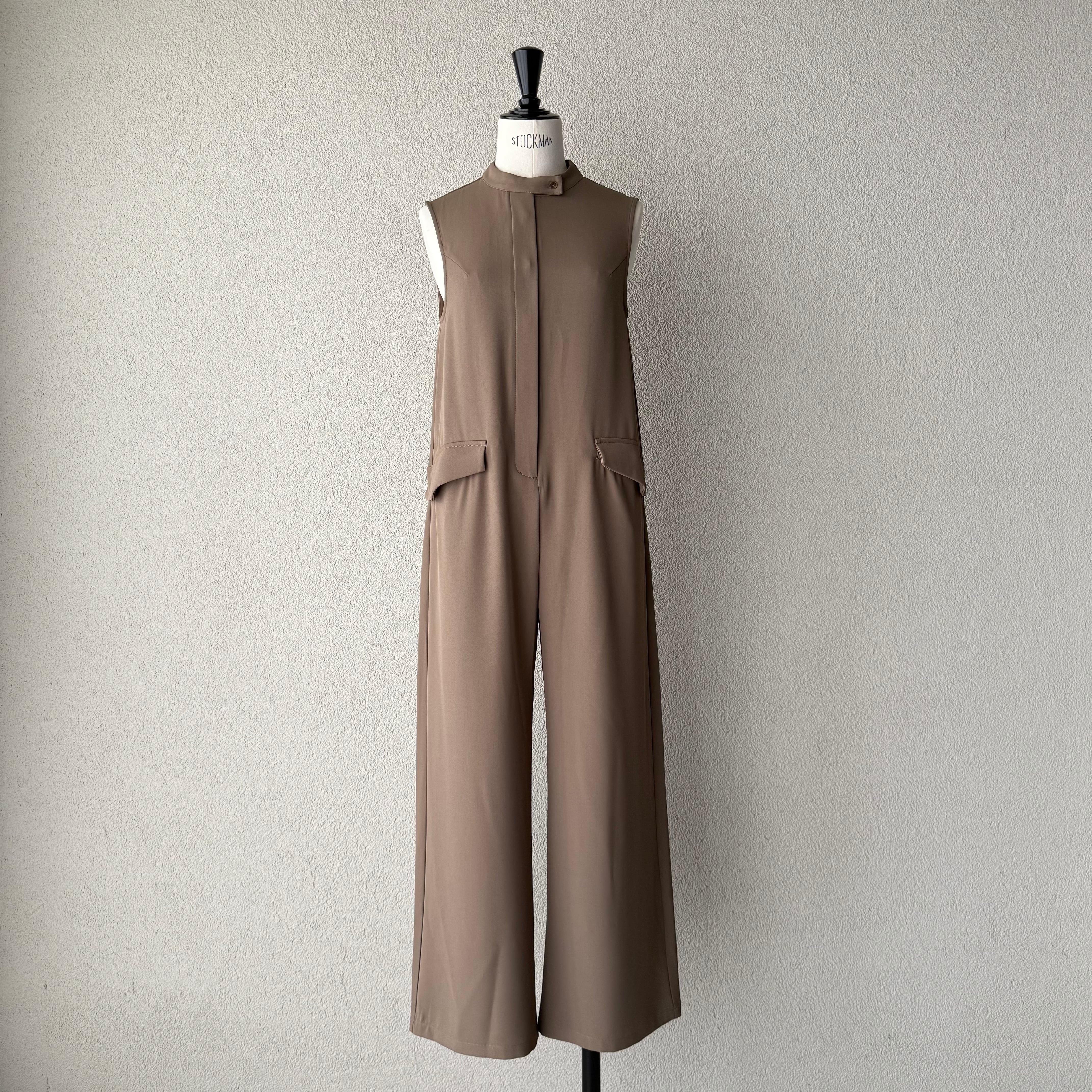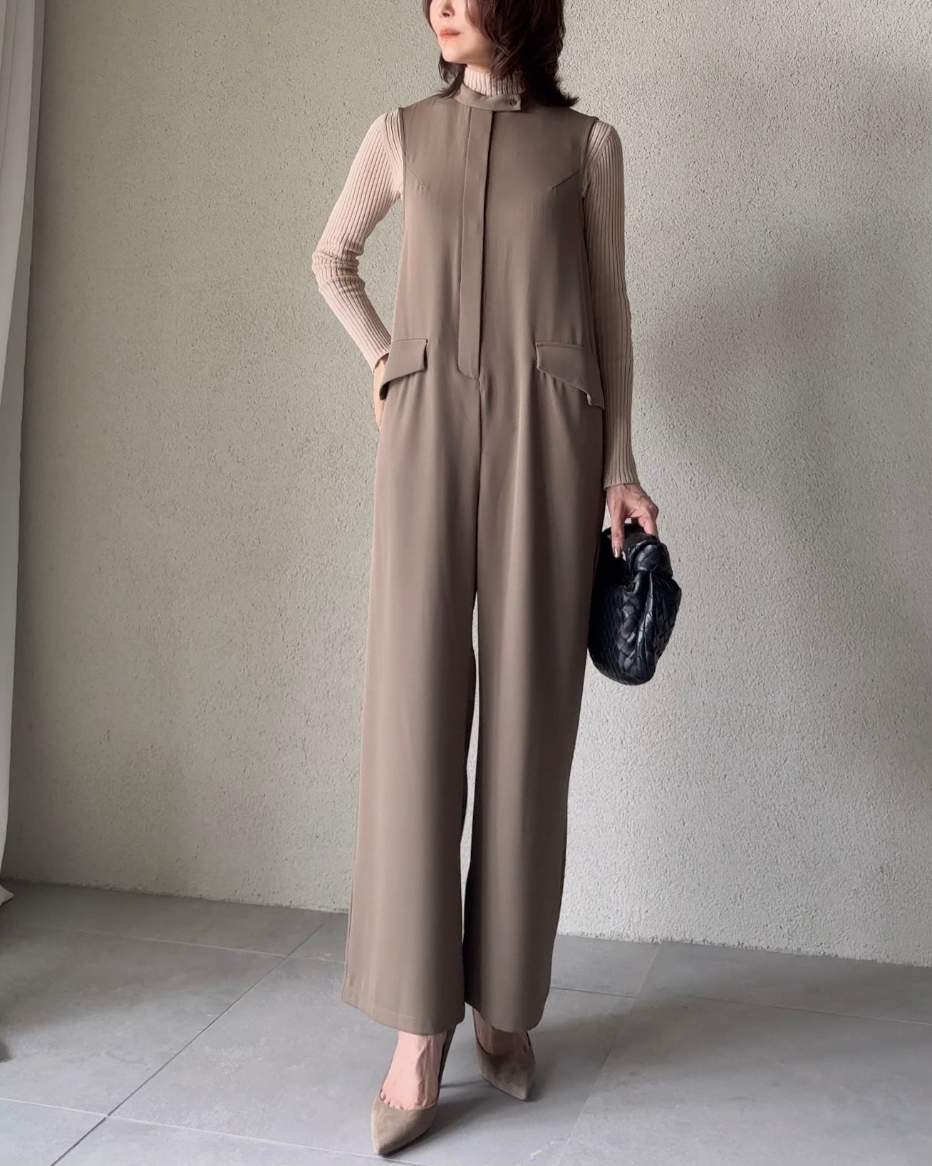 襟元がライダースカラーデザインのハンサムなオールインワン。