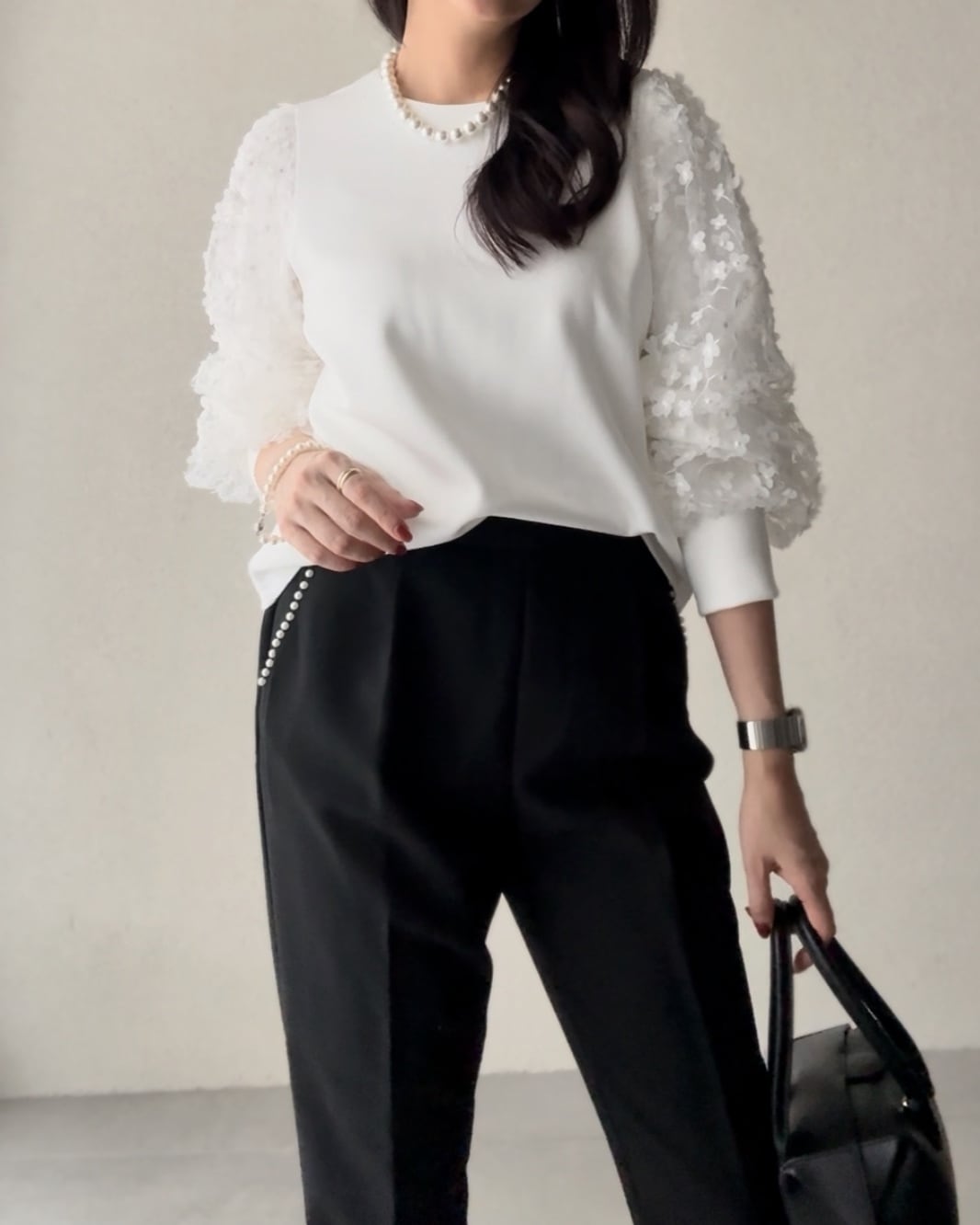 シンプルなテーパードパンツにパールを