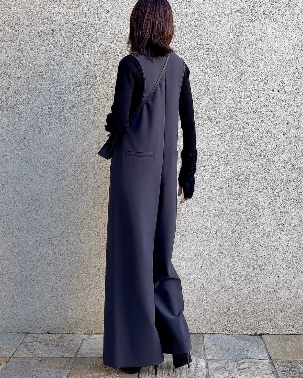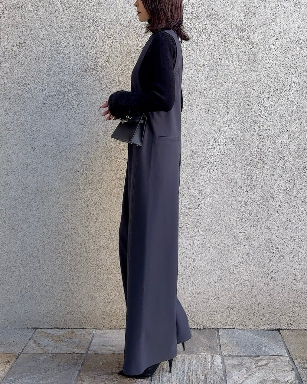 ウエスト位置を高く見せ足長に見せるワイドパンツのシルエットがスタイルアップ効果抜群。