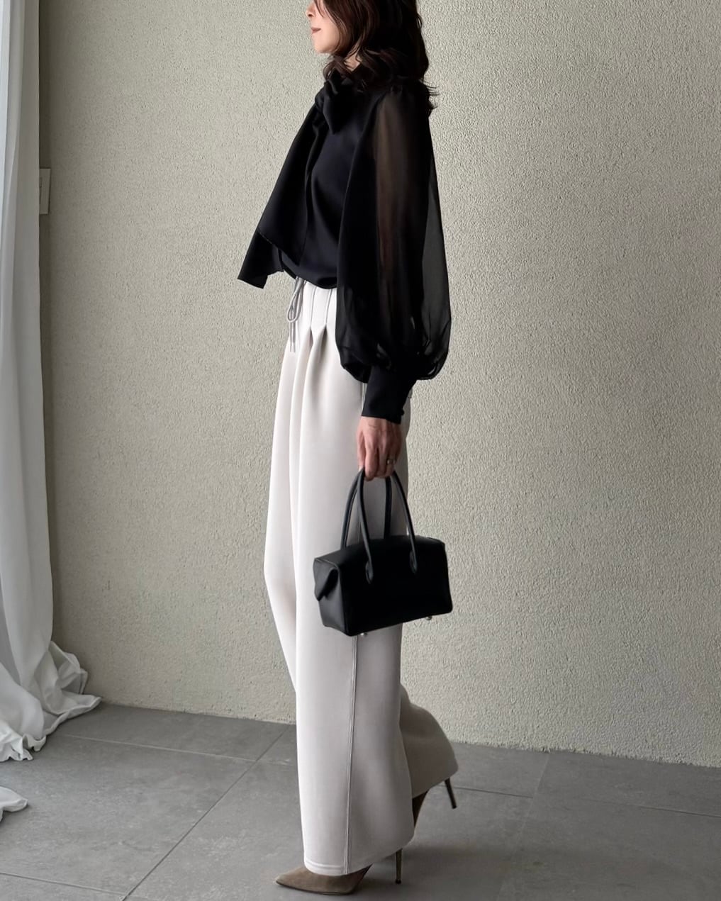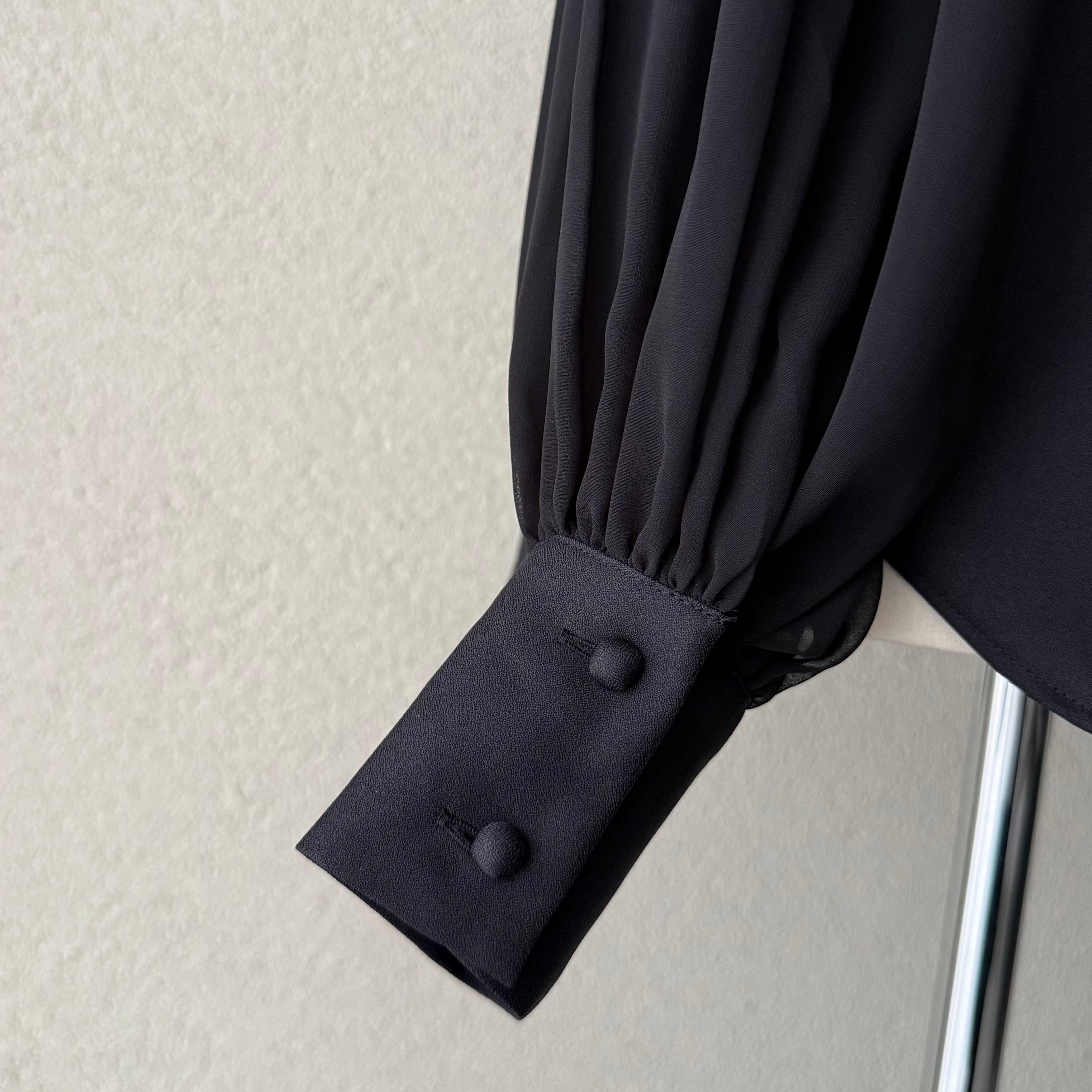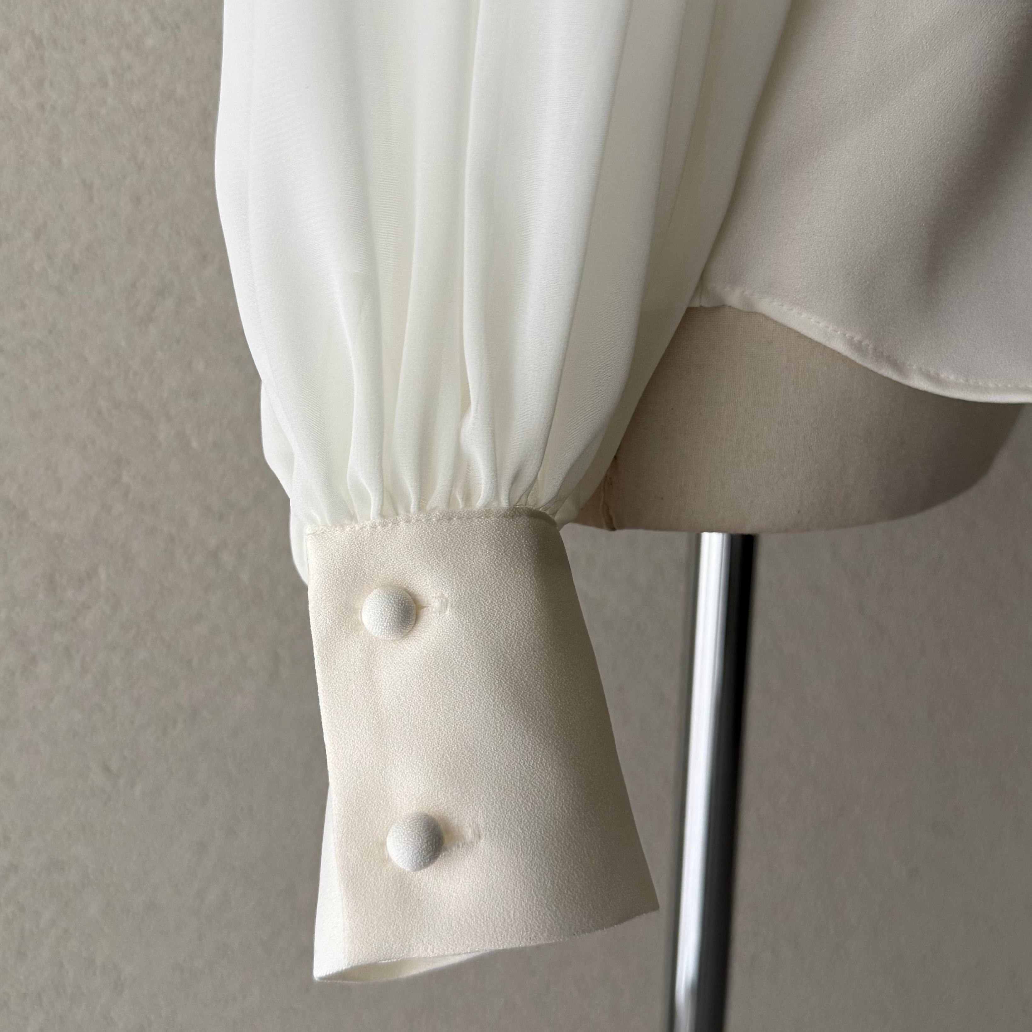 シアー素材のスリーブは袖口にたっぷりギャザーを寄せ