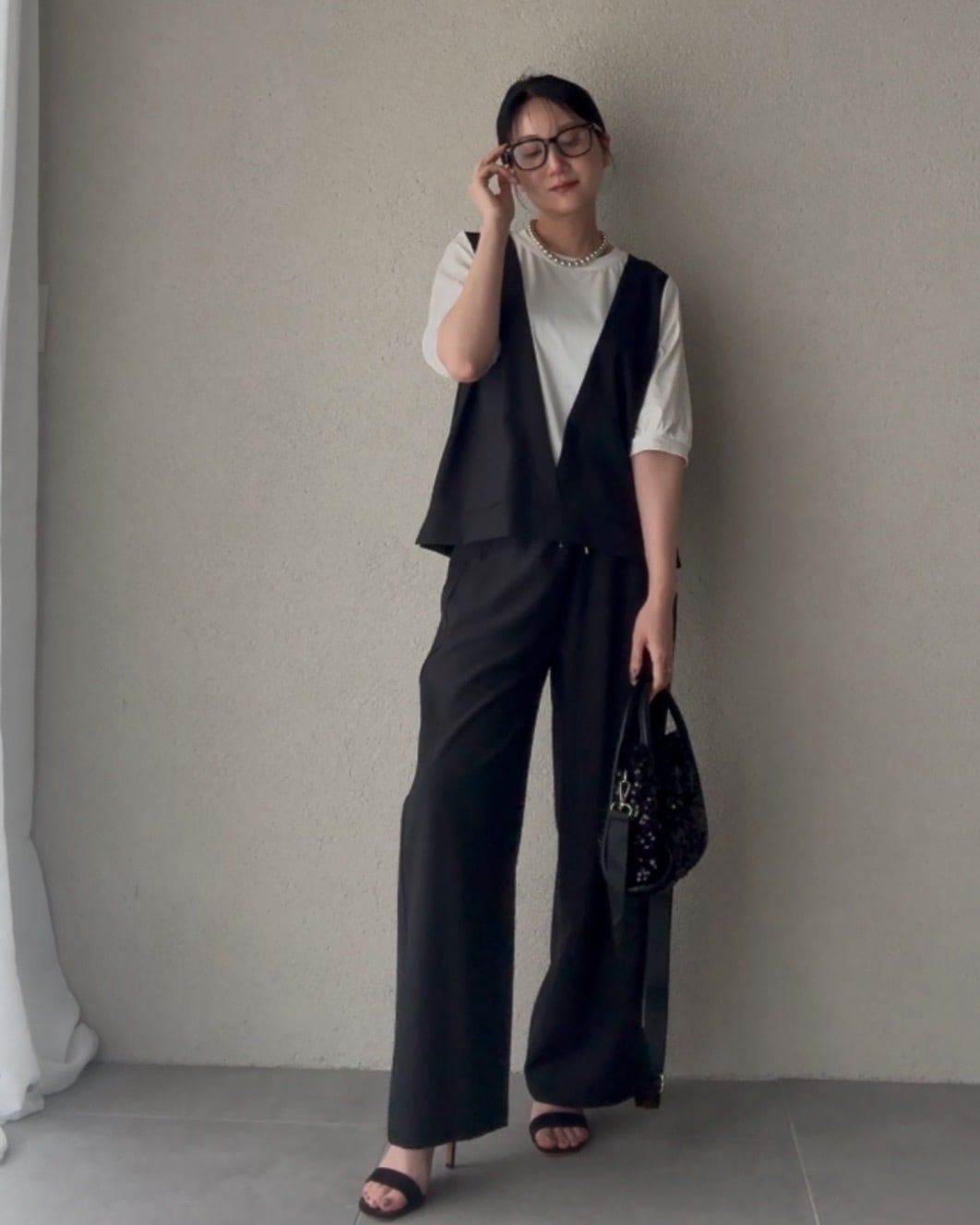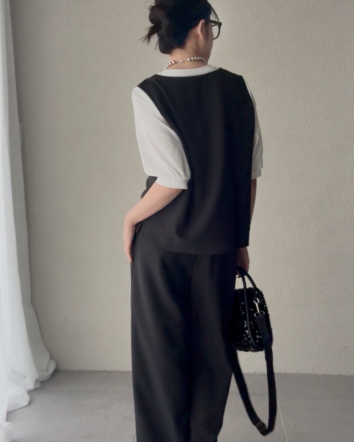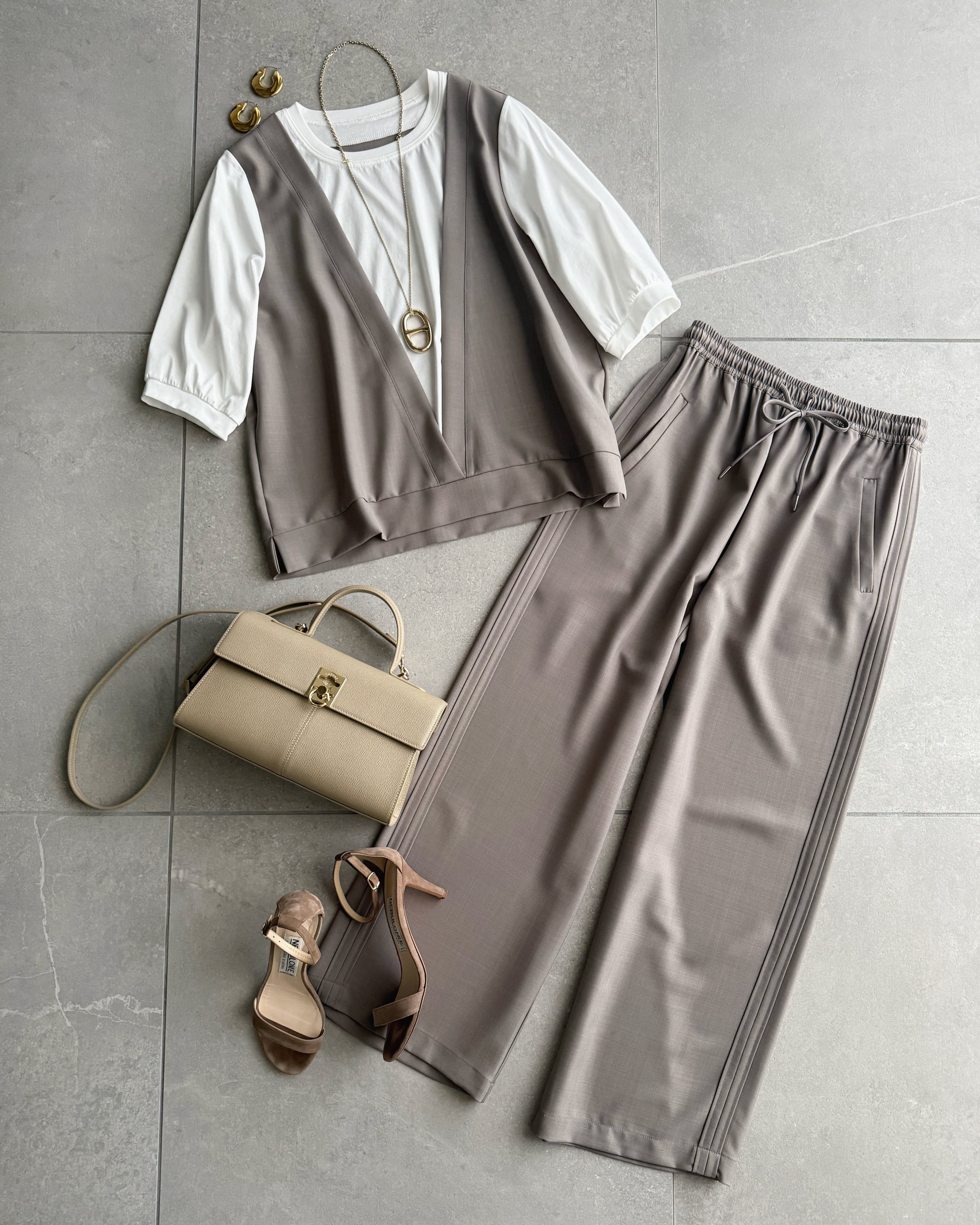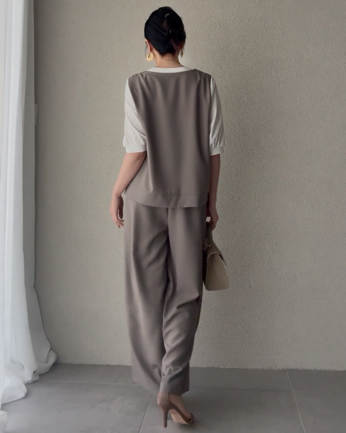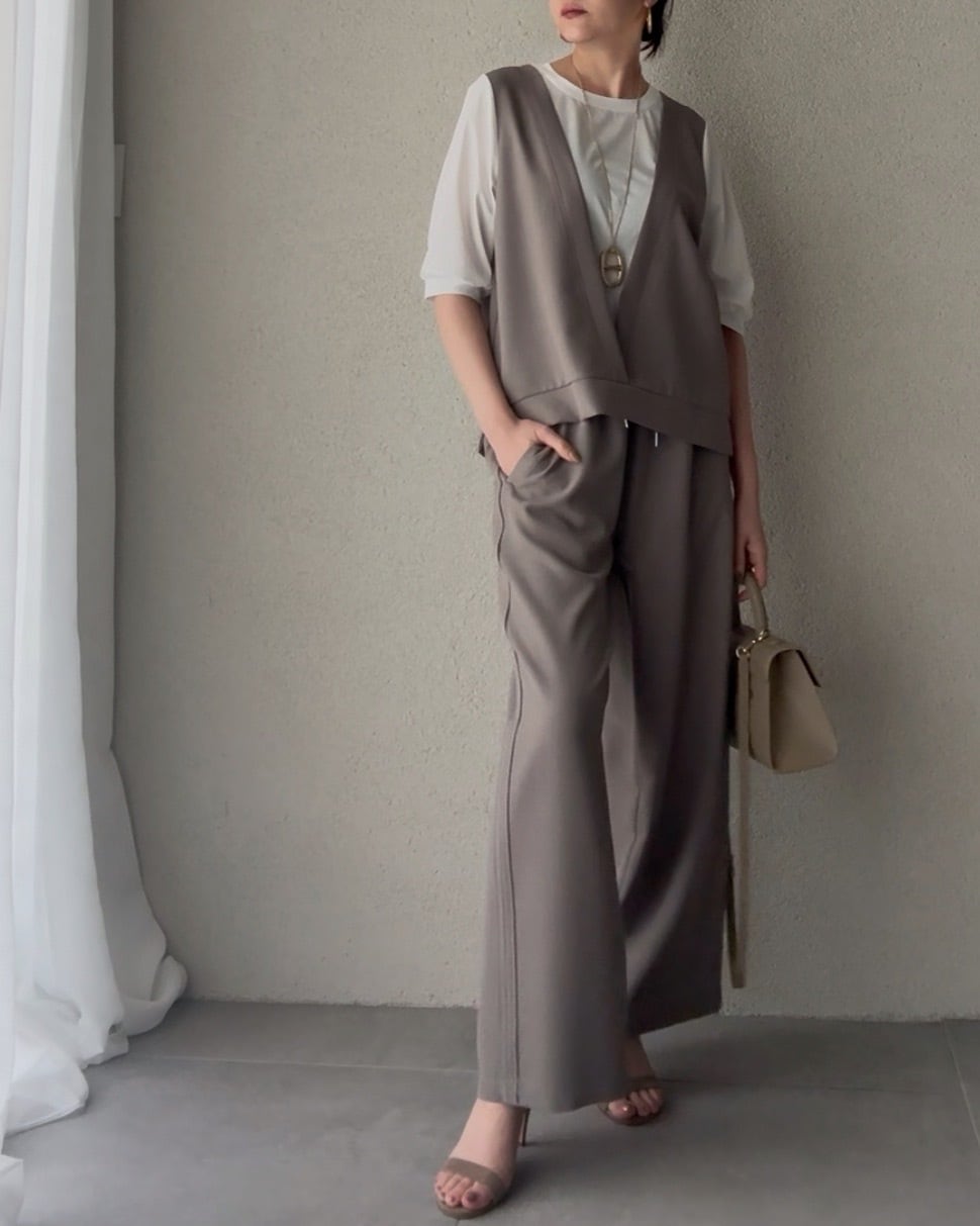 同素材を使用したワイドパンツと合わせると