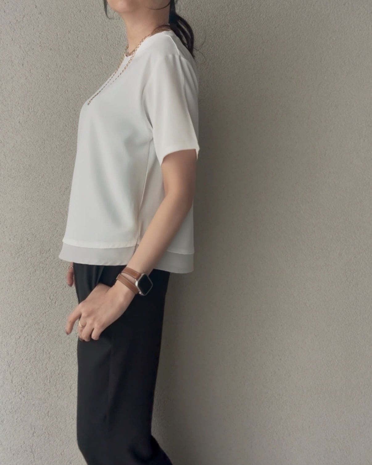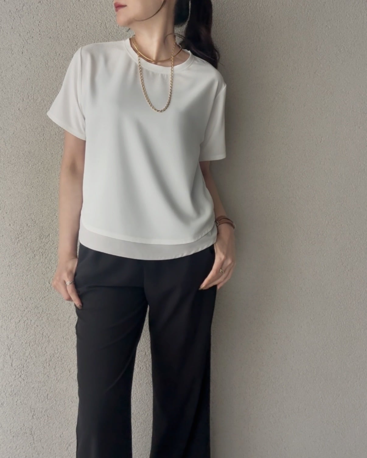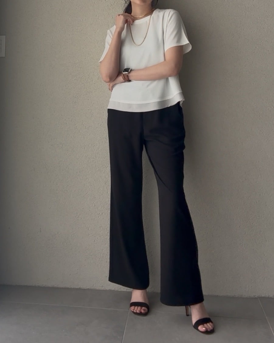 使用したレイヤード風デザインのカットソー。