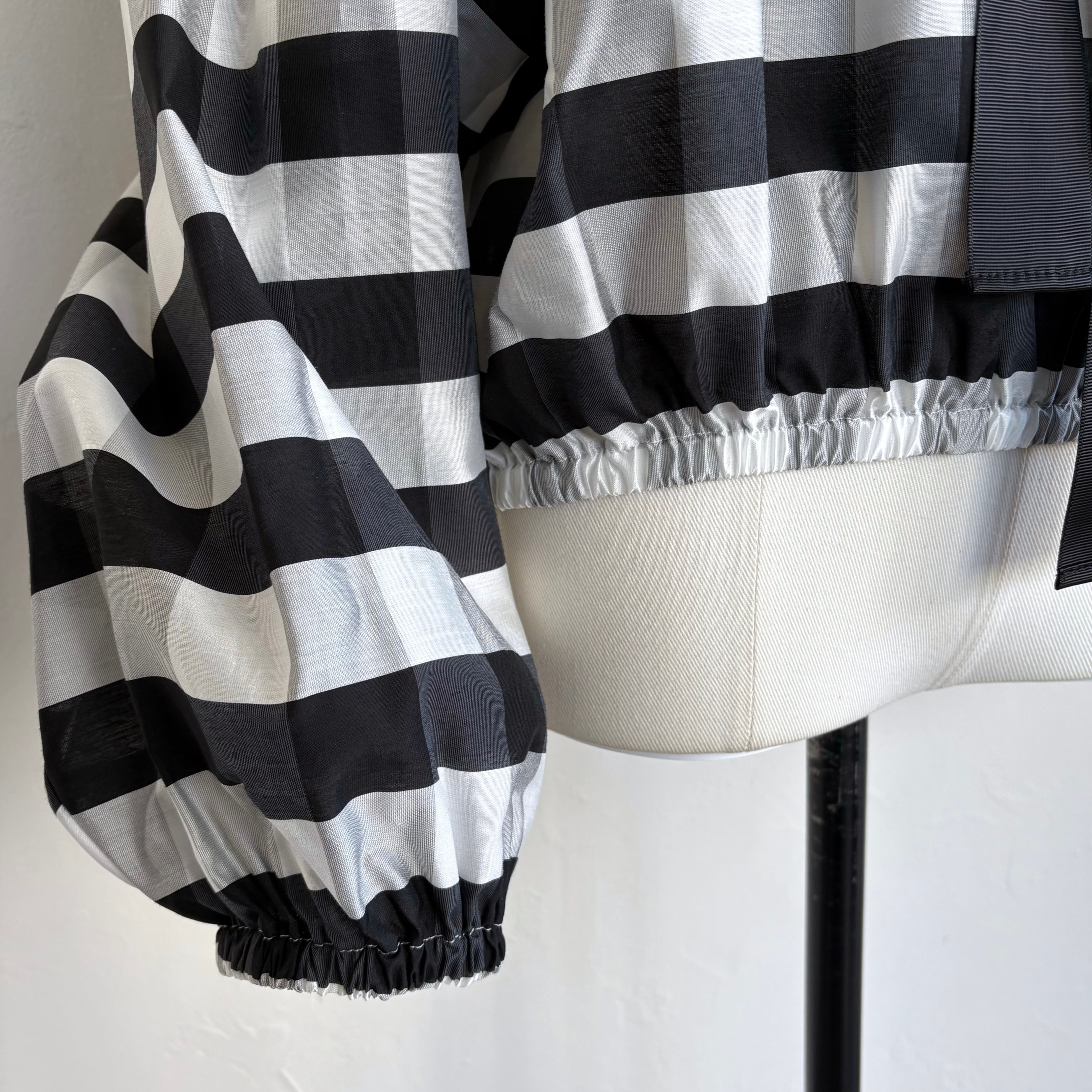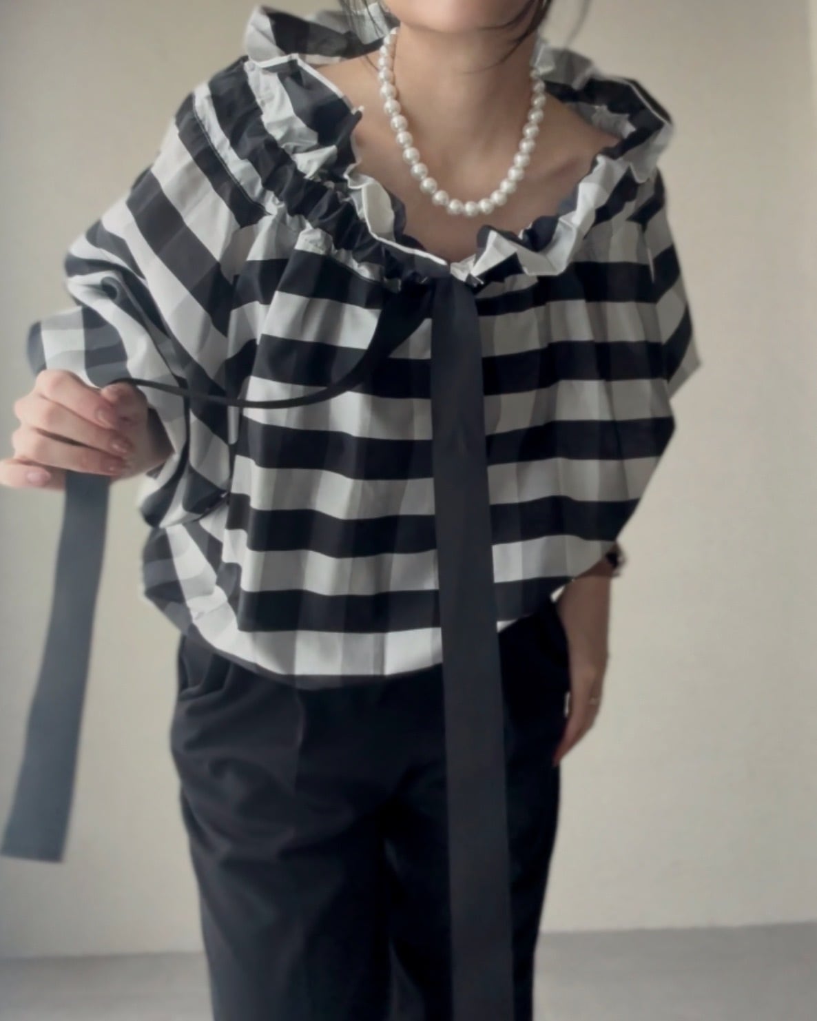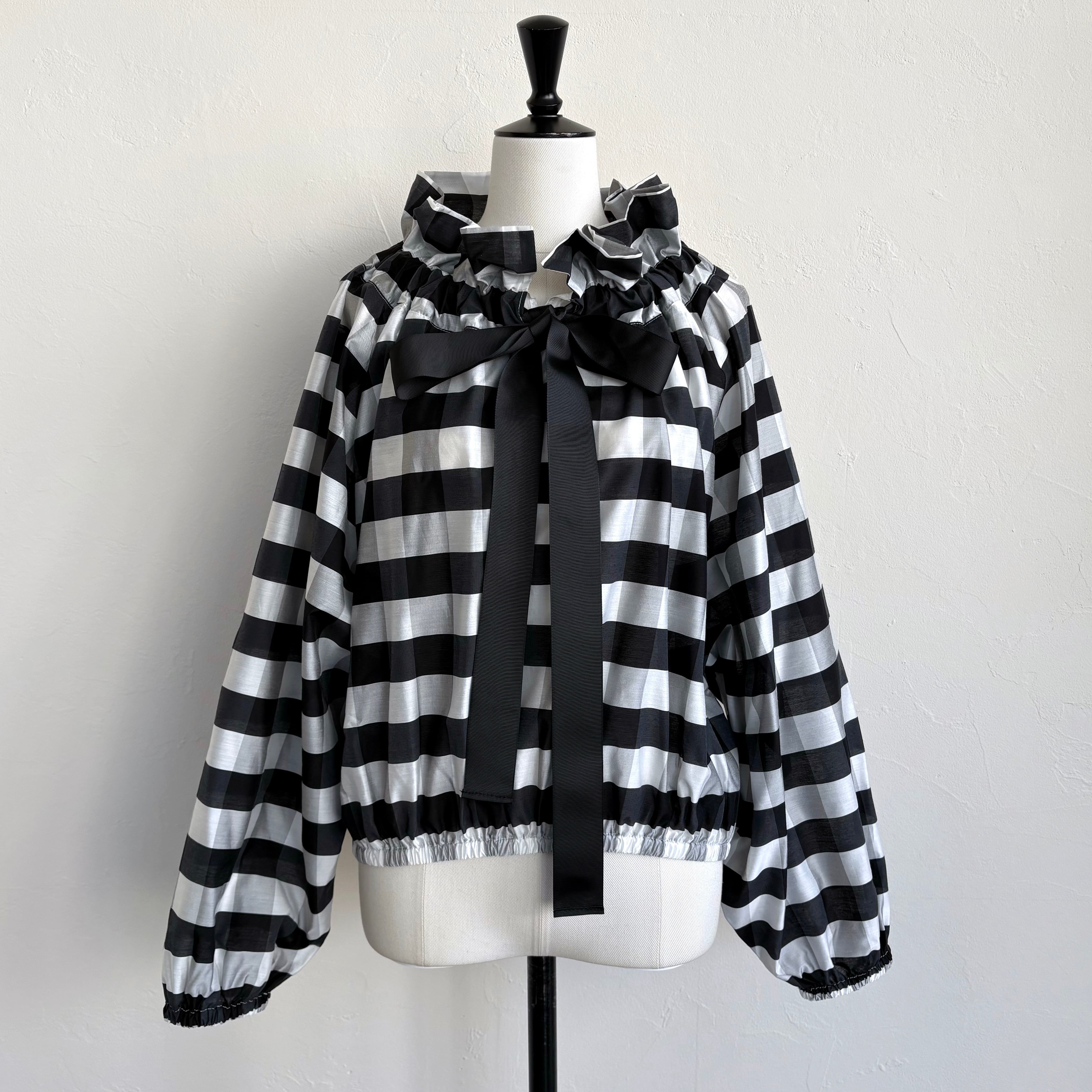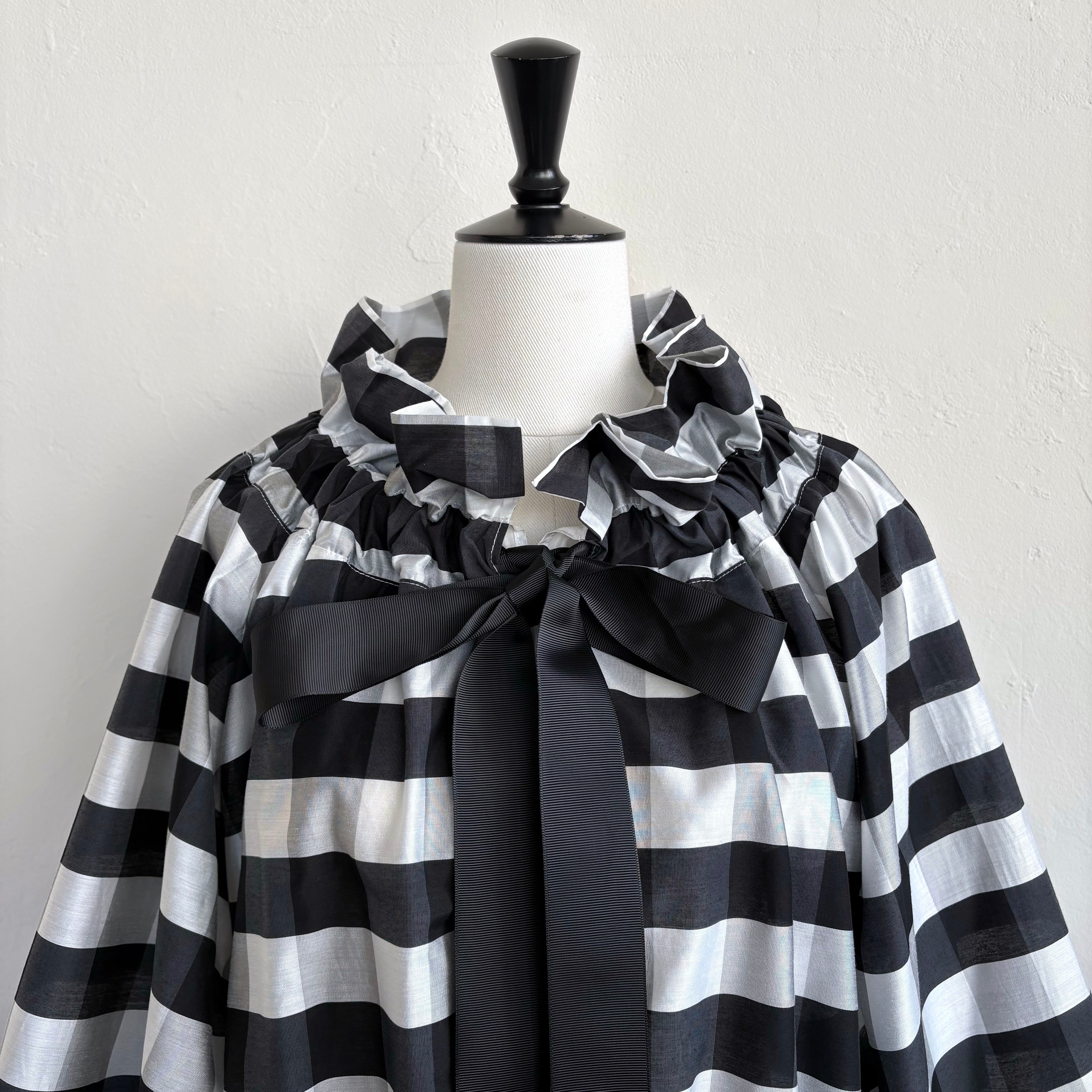 襟元のリボンを絞ってギャザーを寄せたり