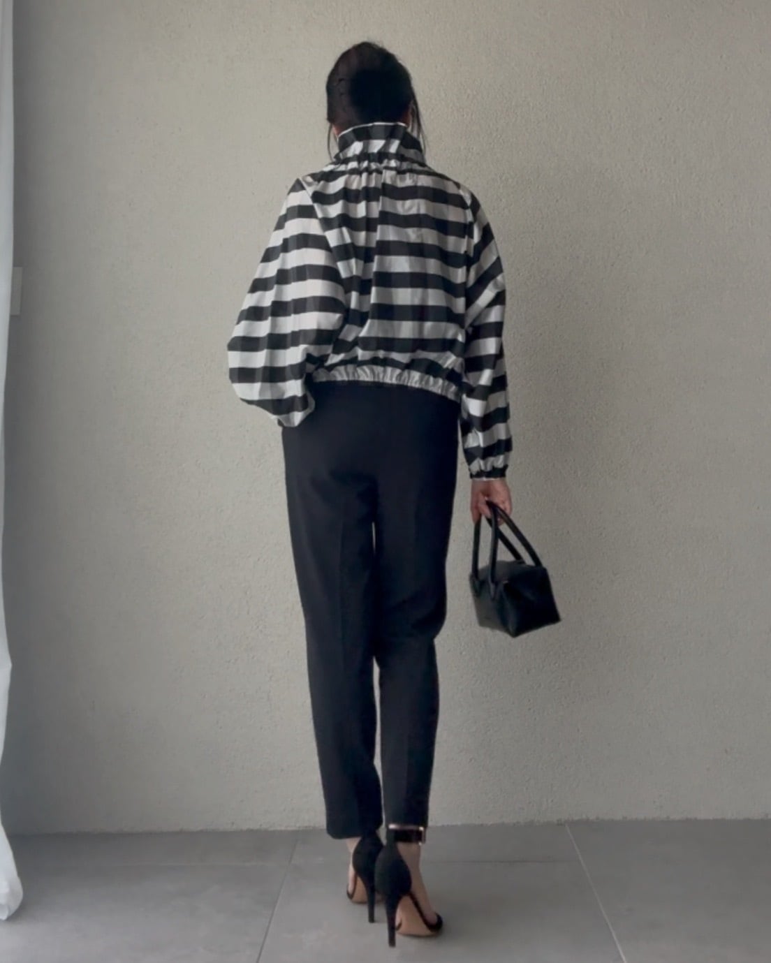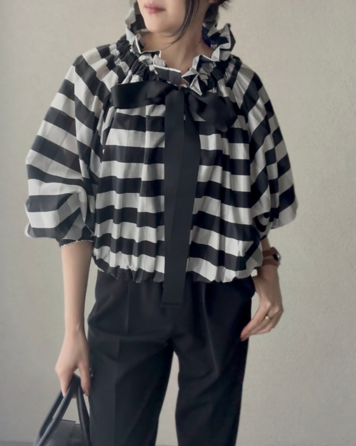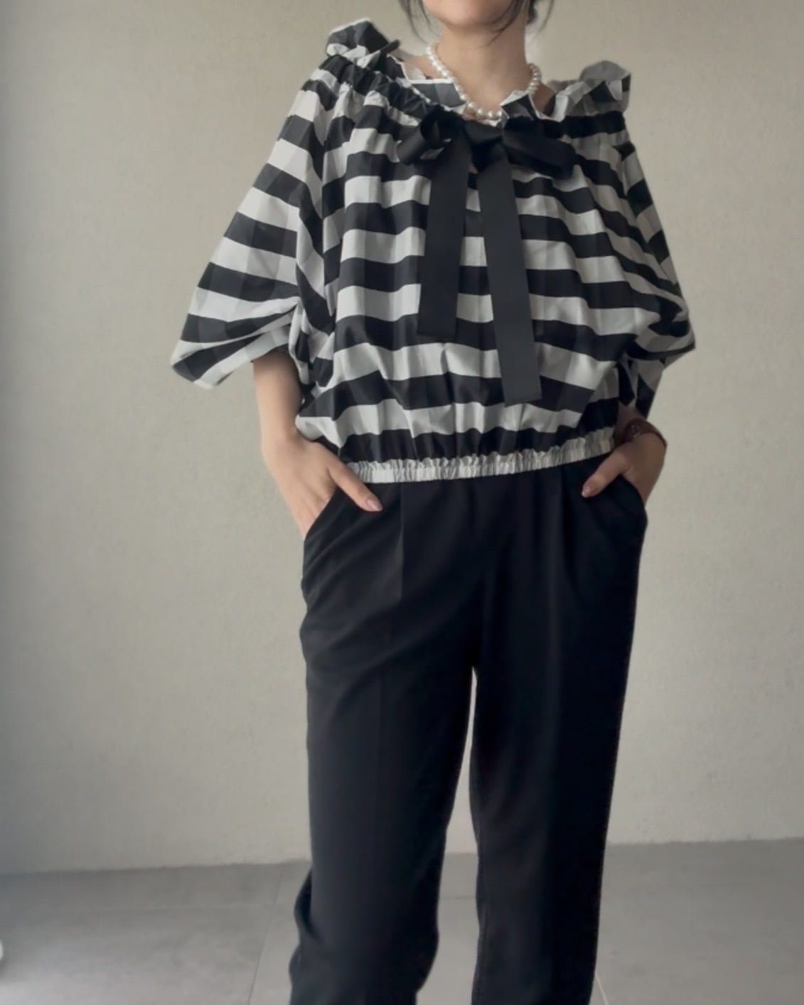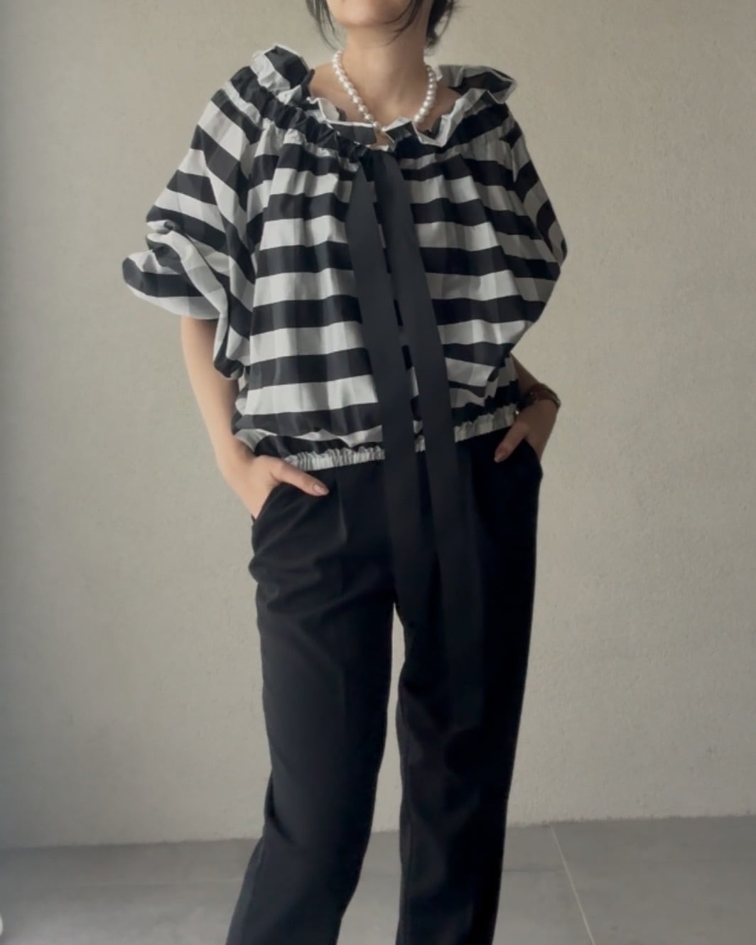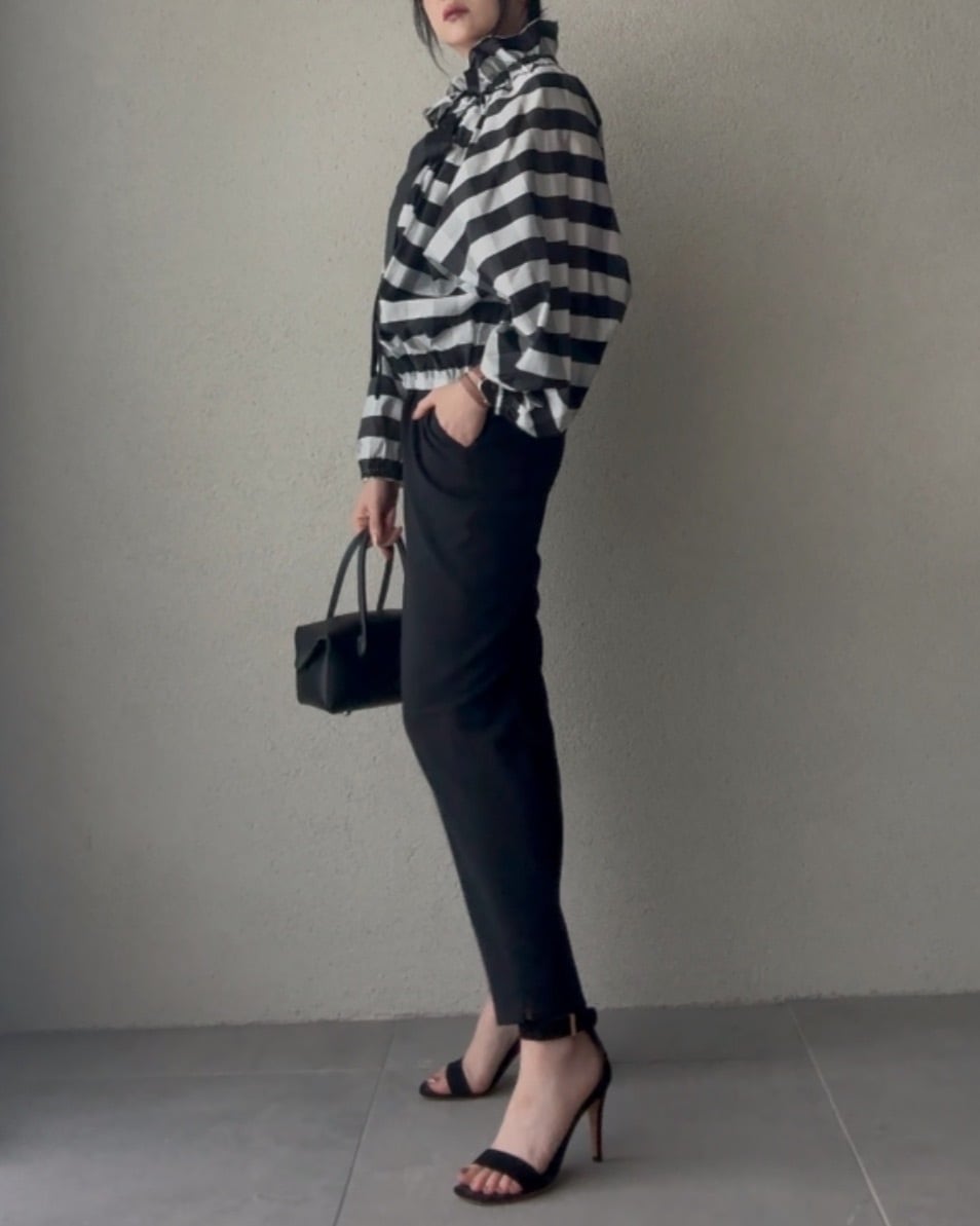 緩めてオフショルダー風の着こなしも素敵。