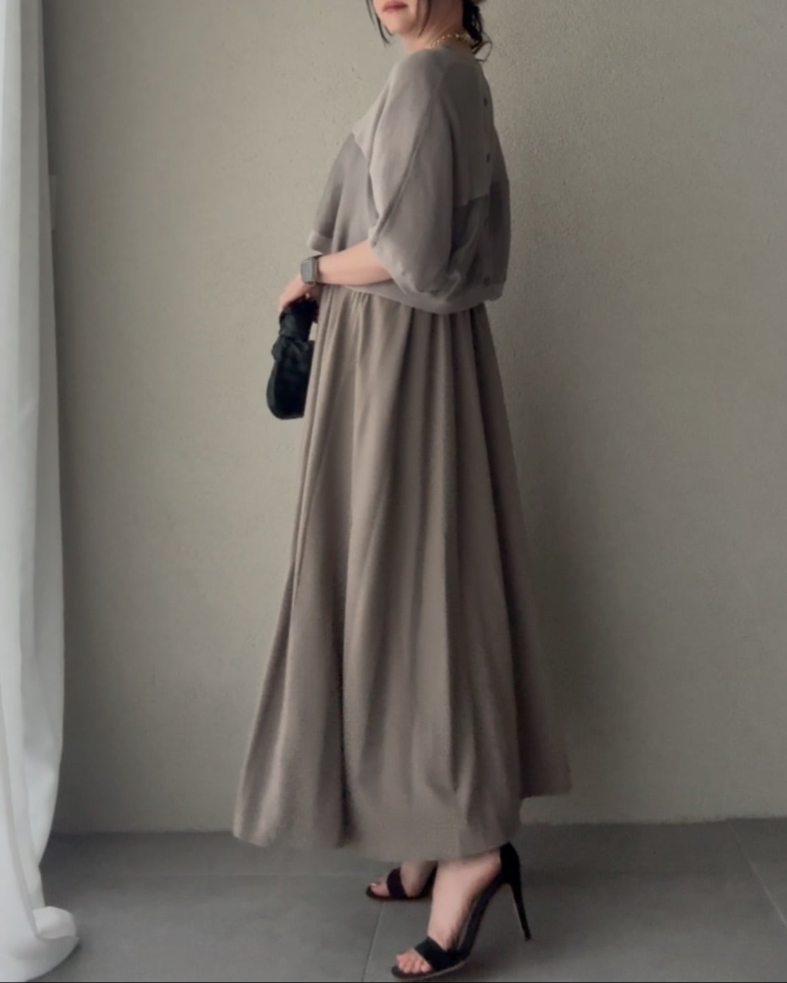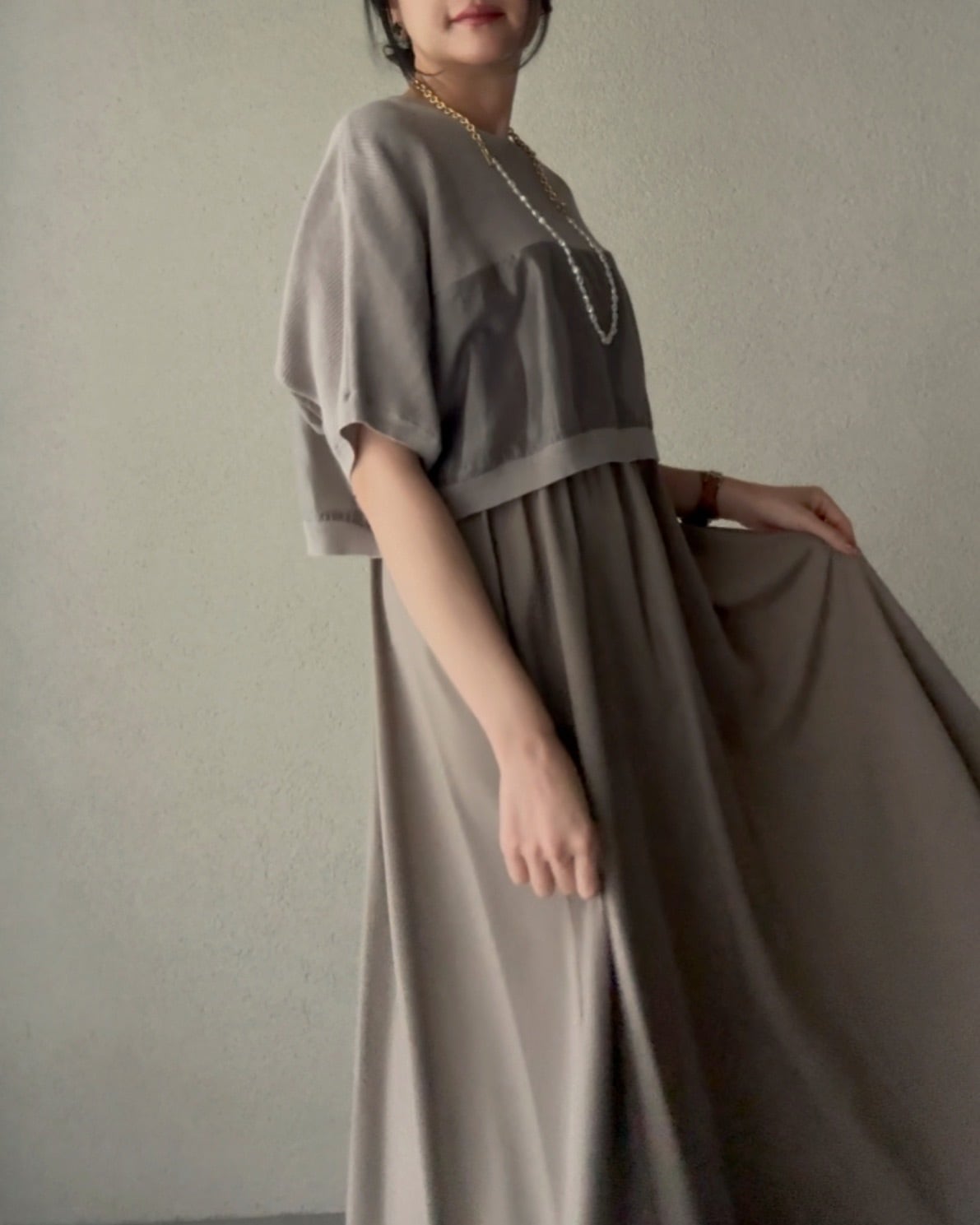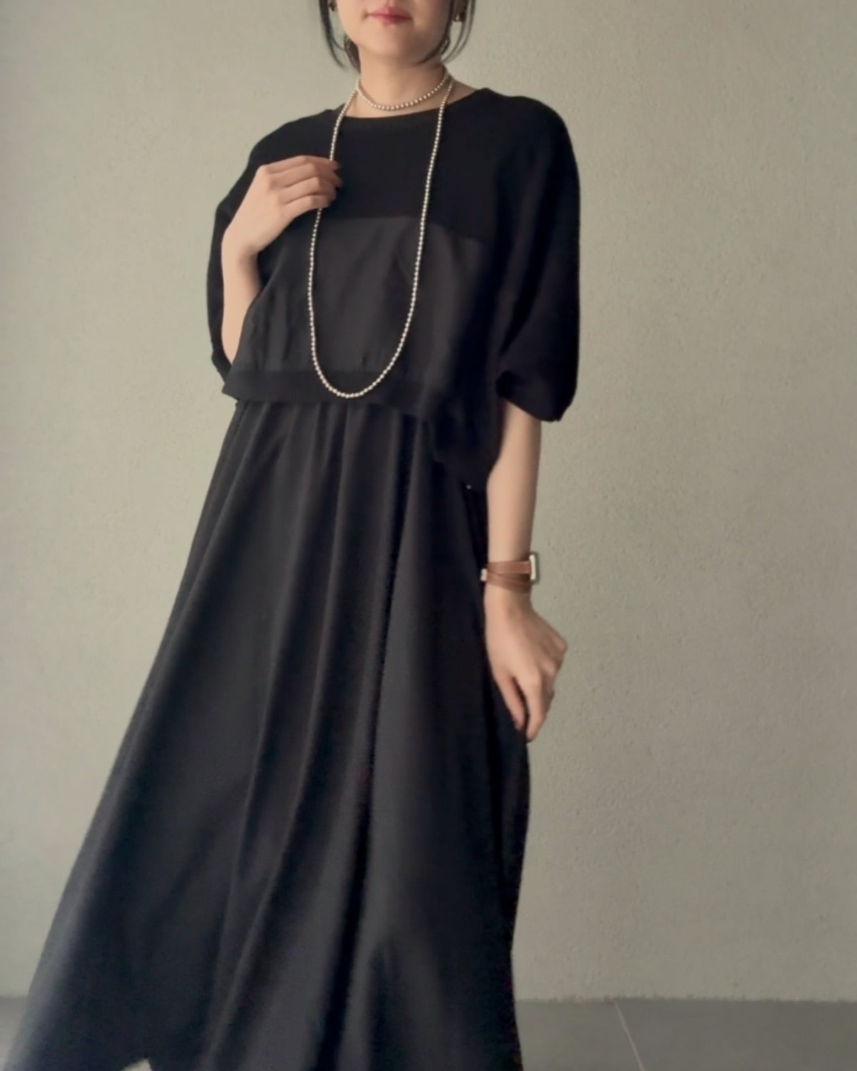 ワンピースは落ち感の綺麗な布帛素材を使用。
