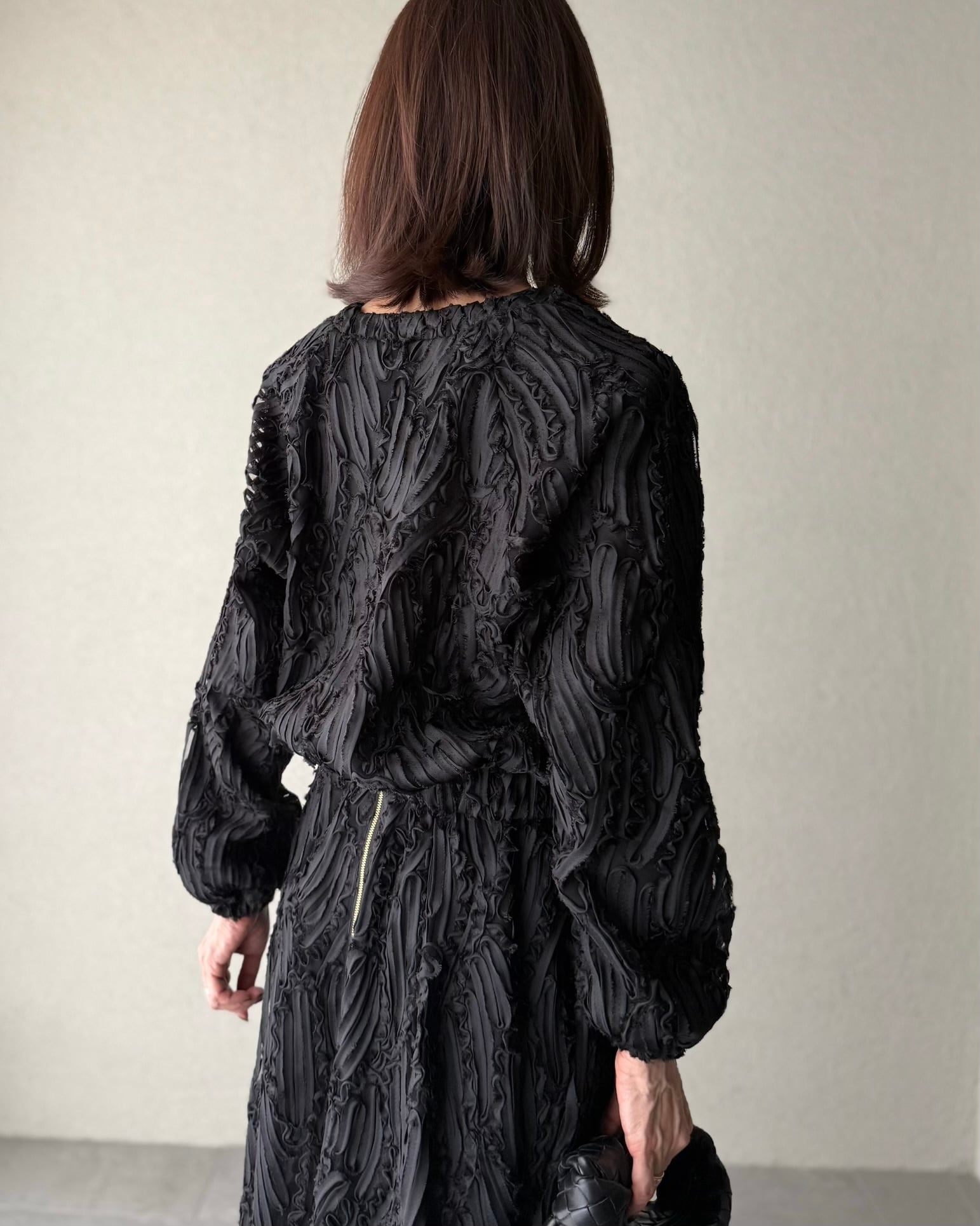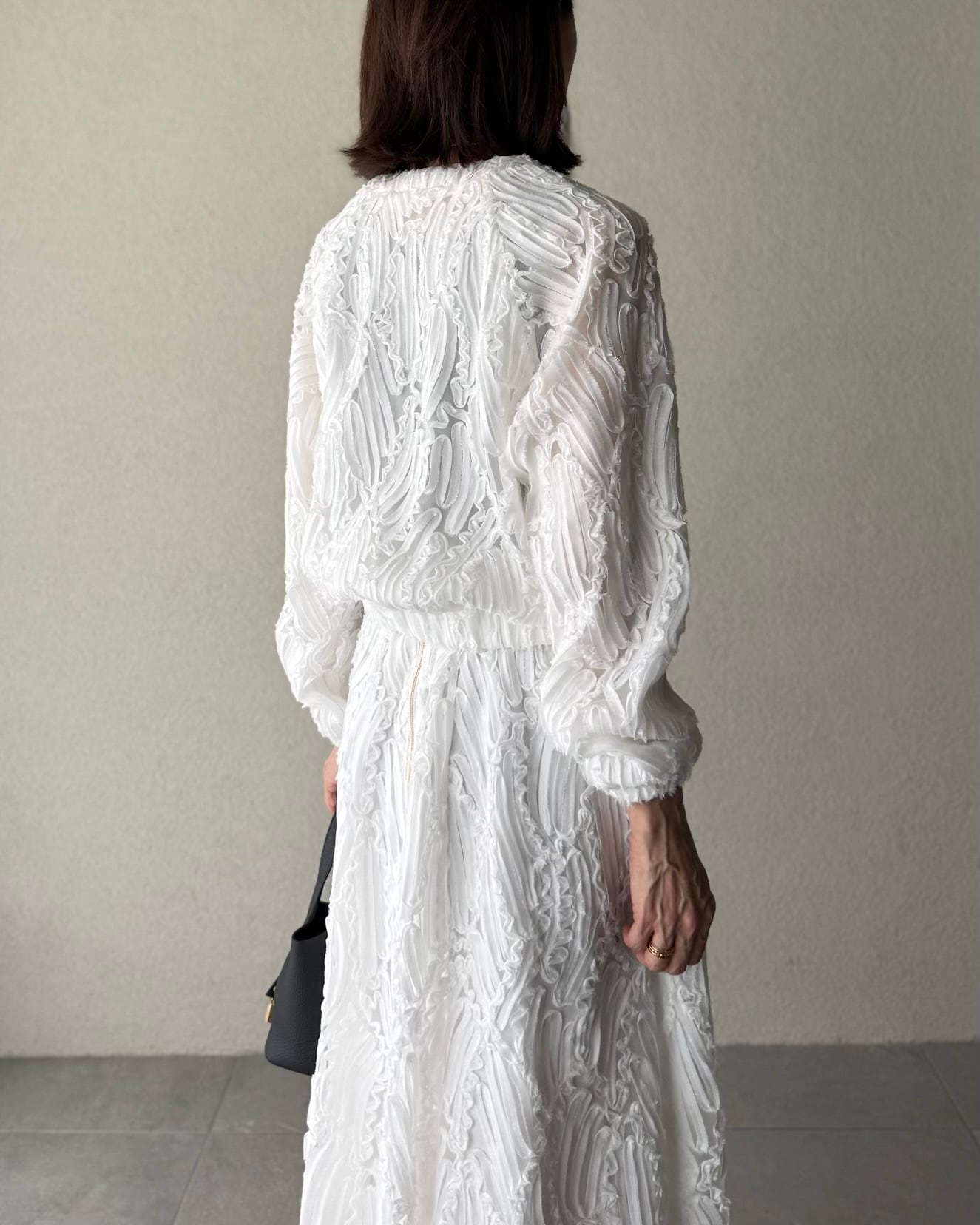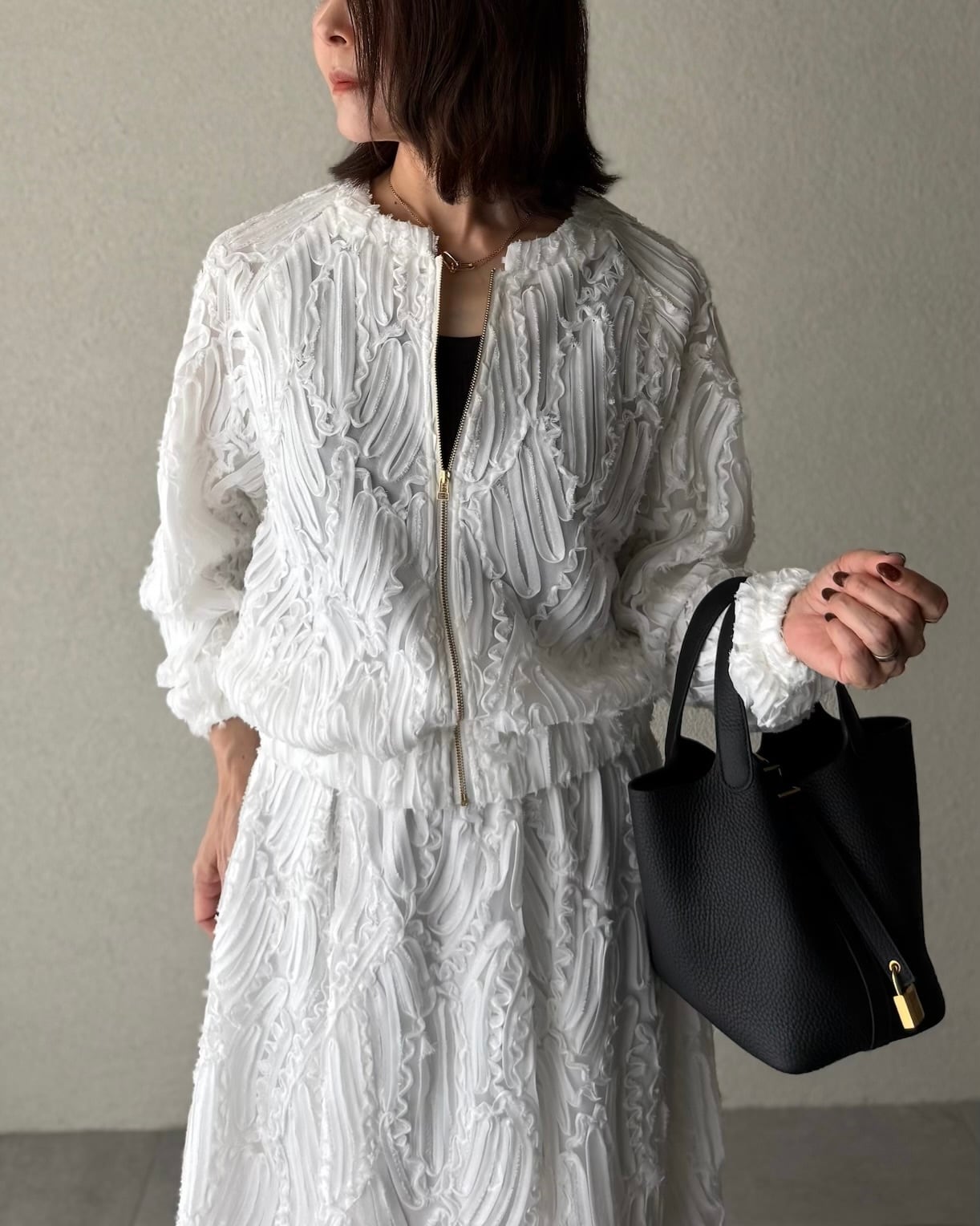 同素材のスカートとセットアップとしても