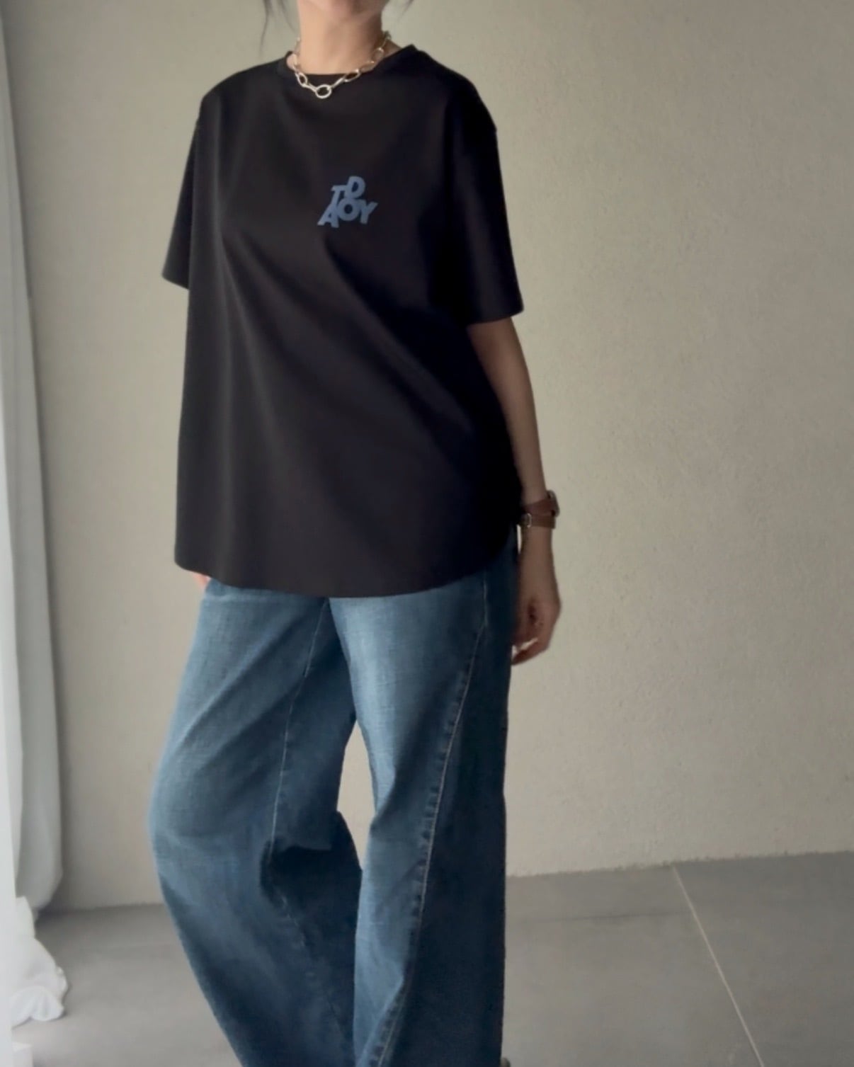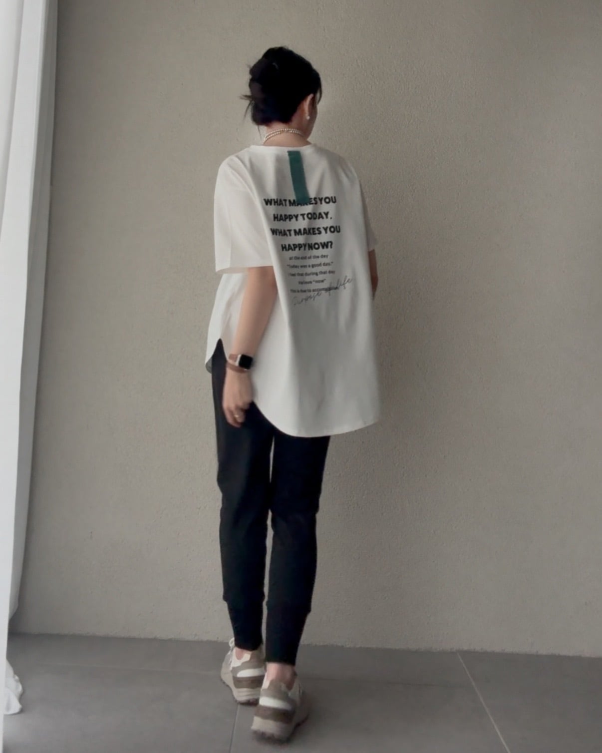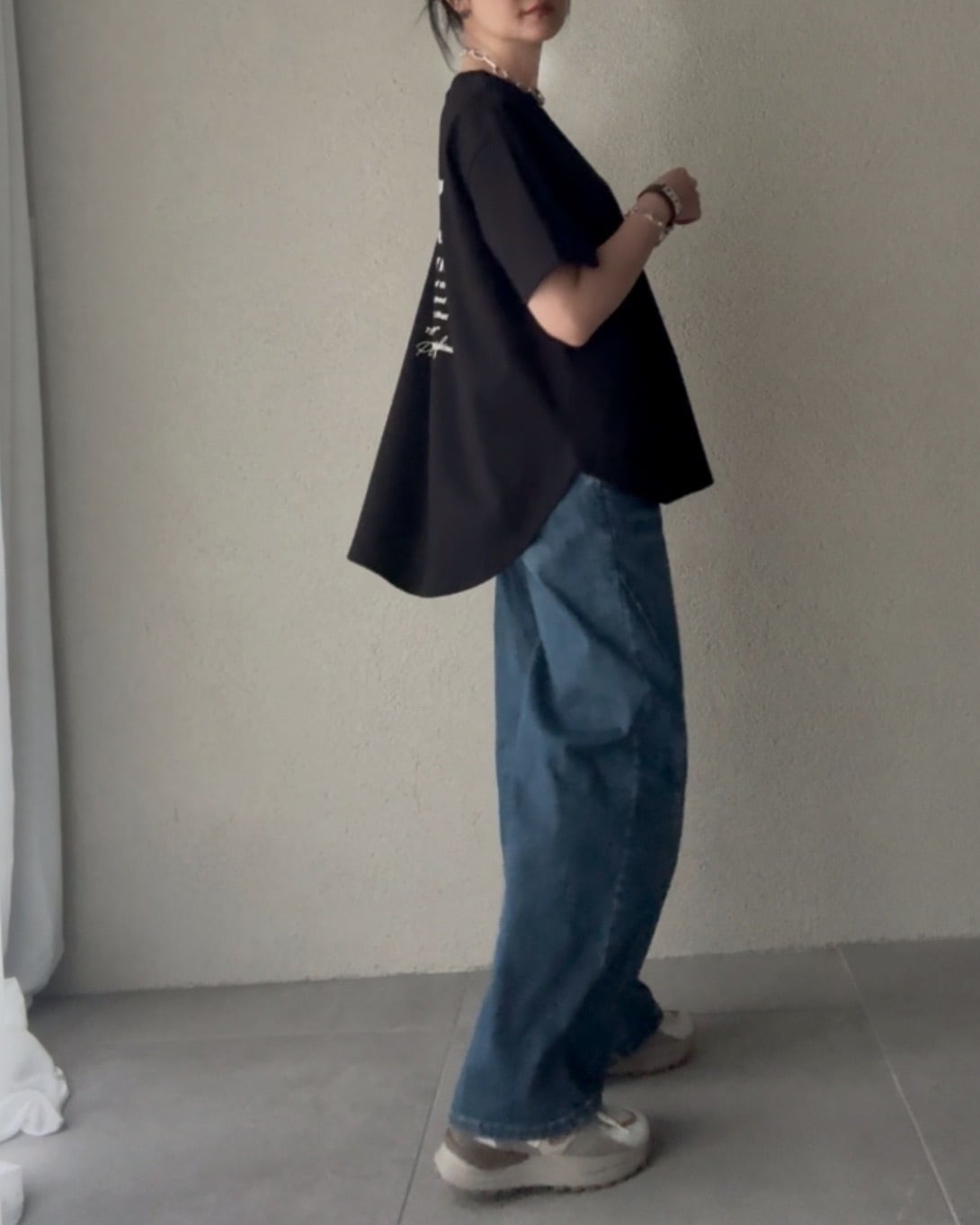 ワイドパンツと少しルーズな着こなしも。