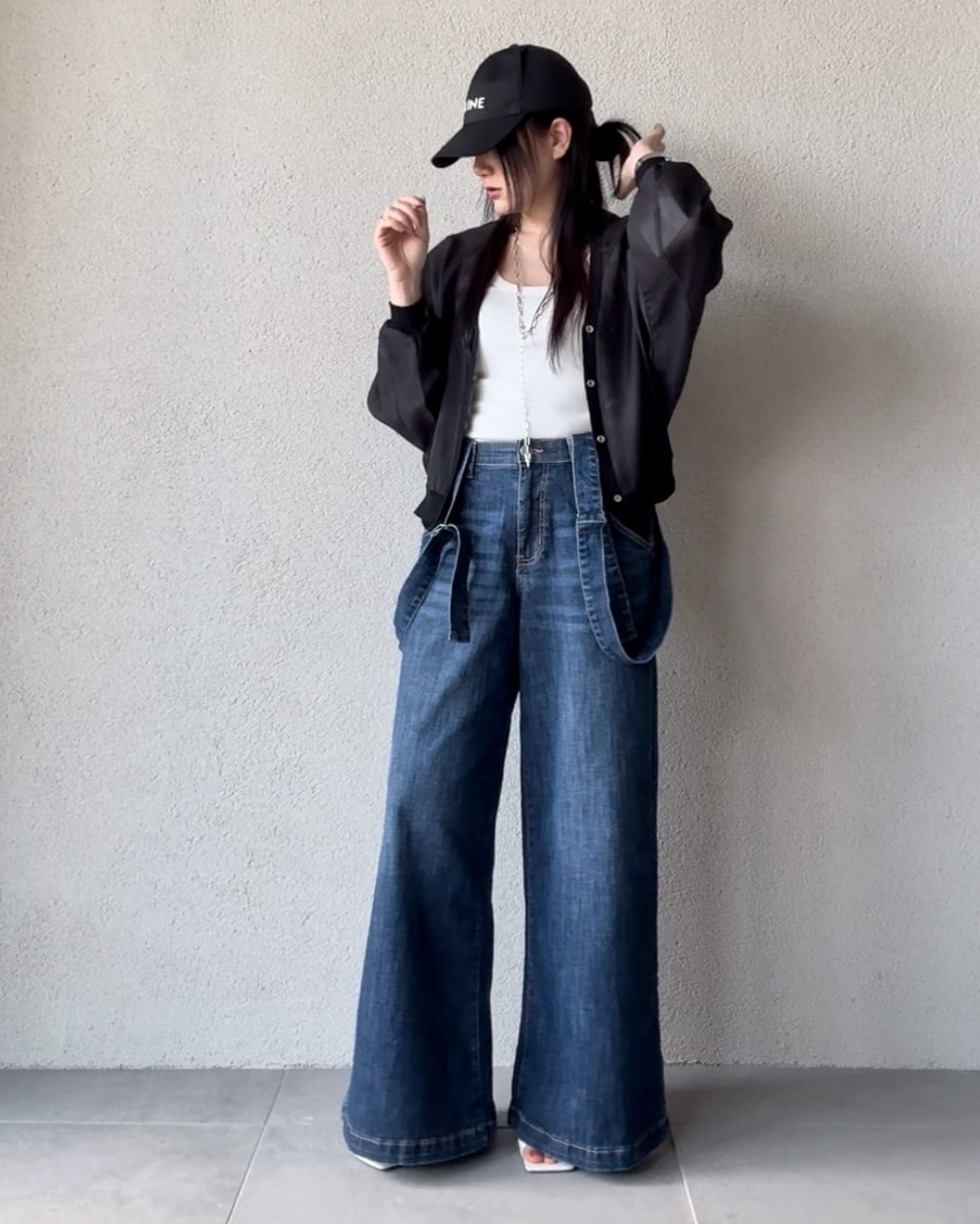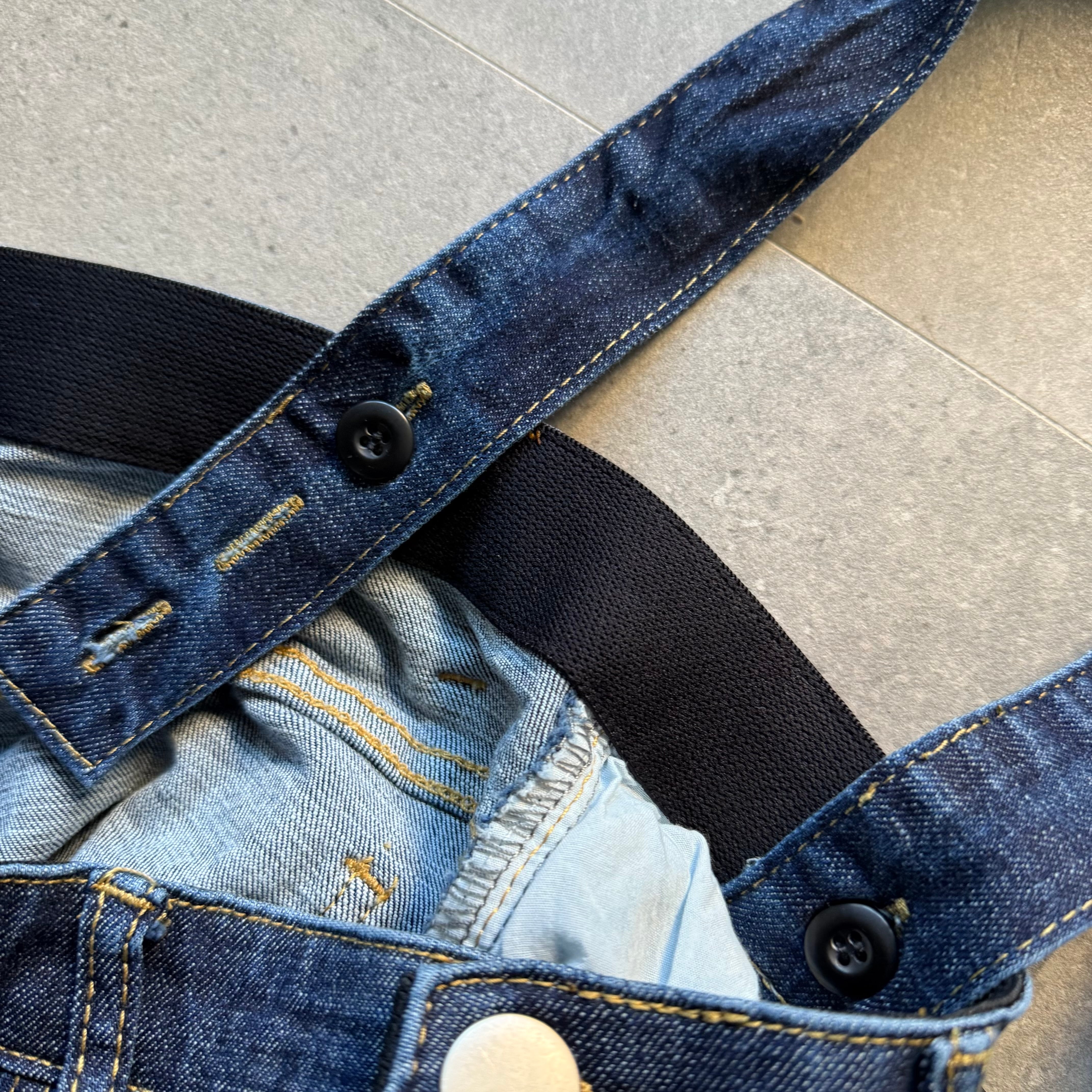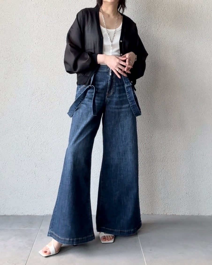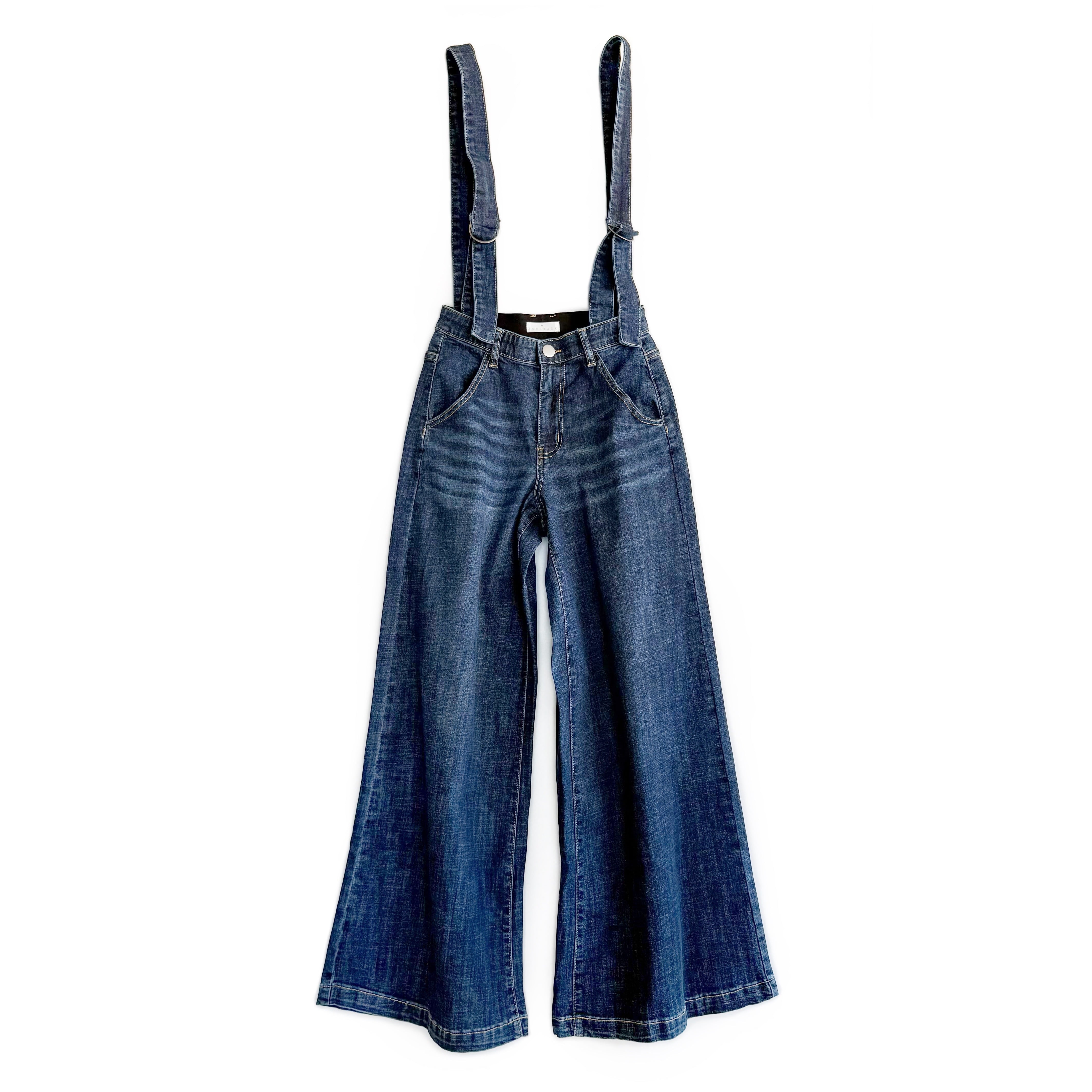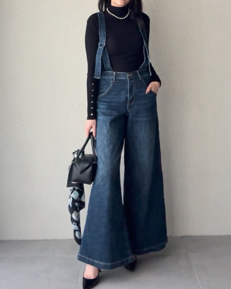 サスペンダーデニムパンツ。