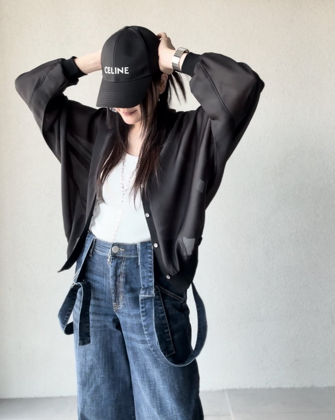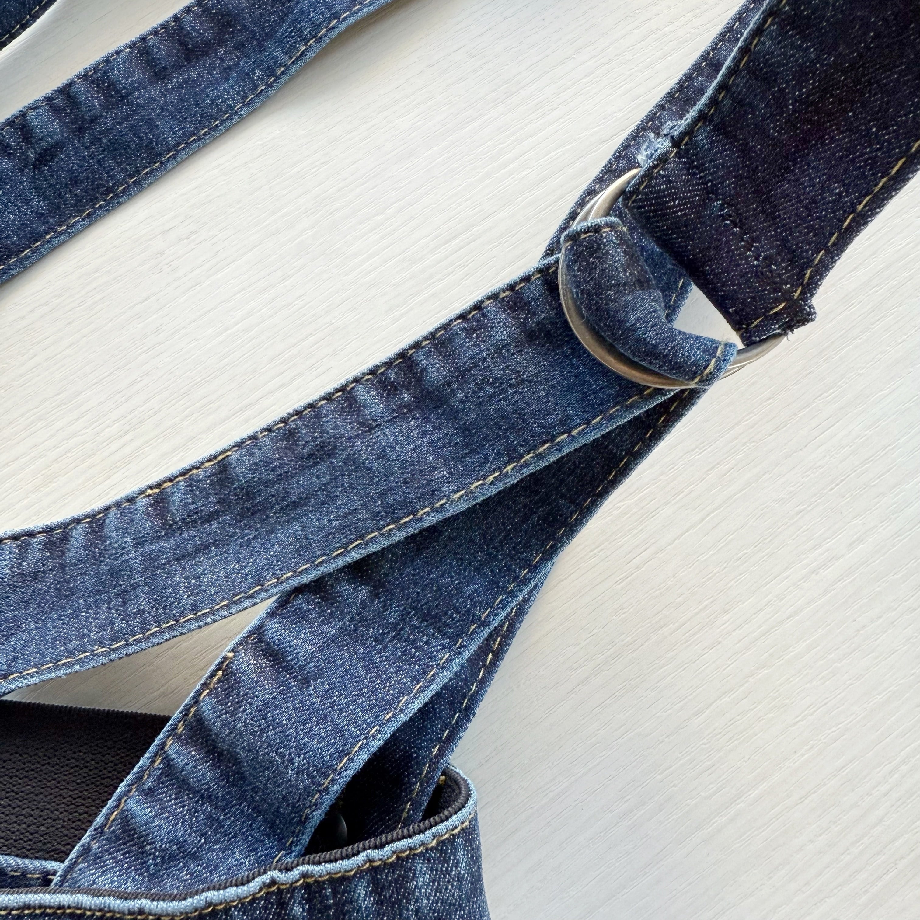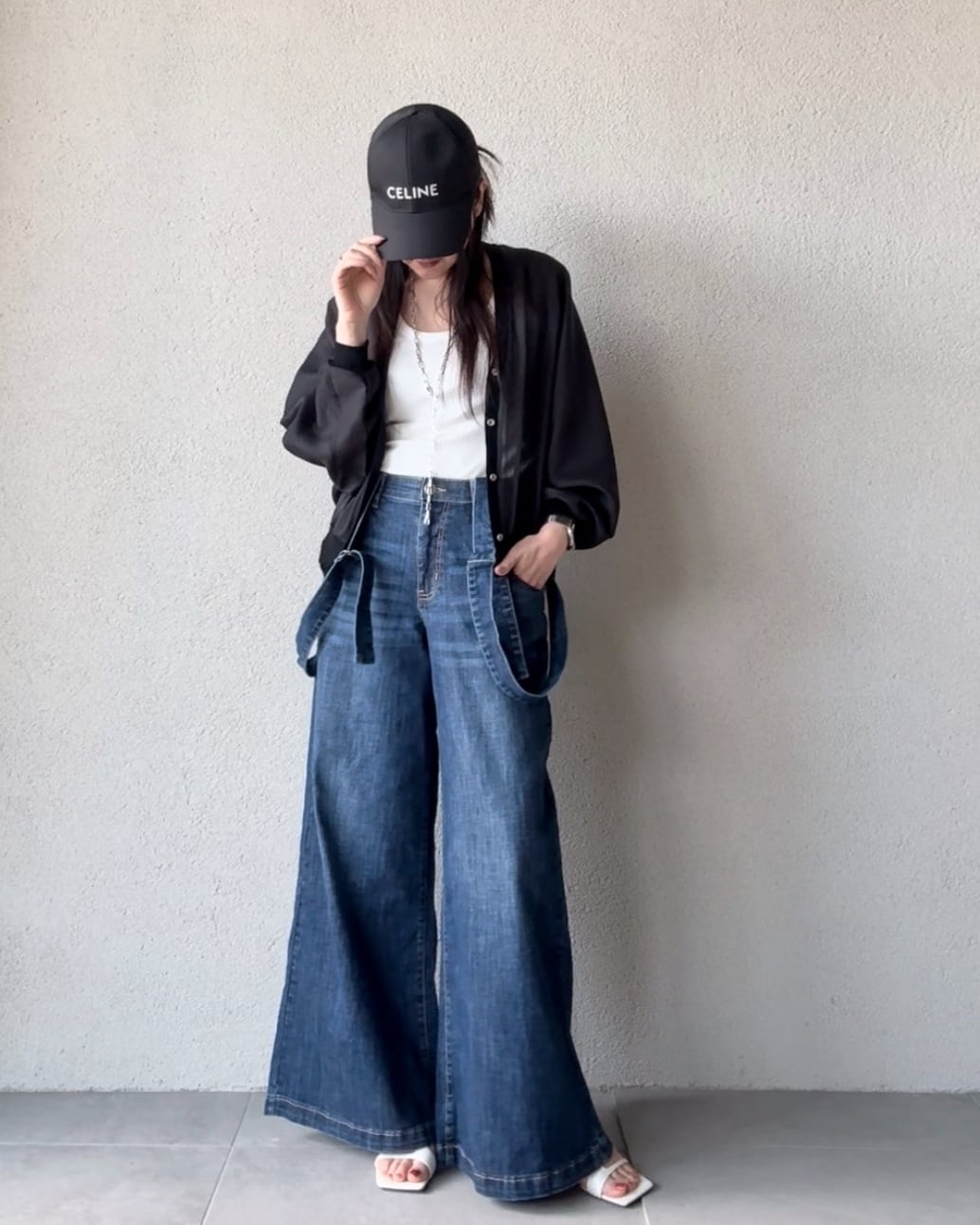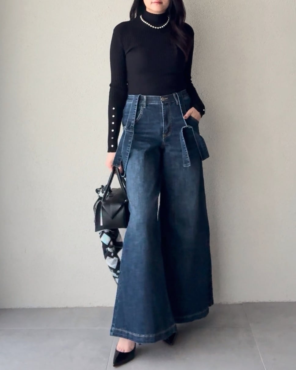 サスペンダーデニムパンツ。