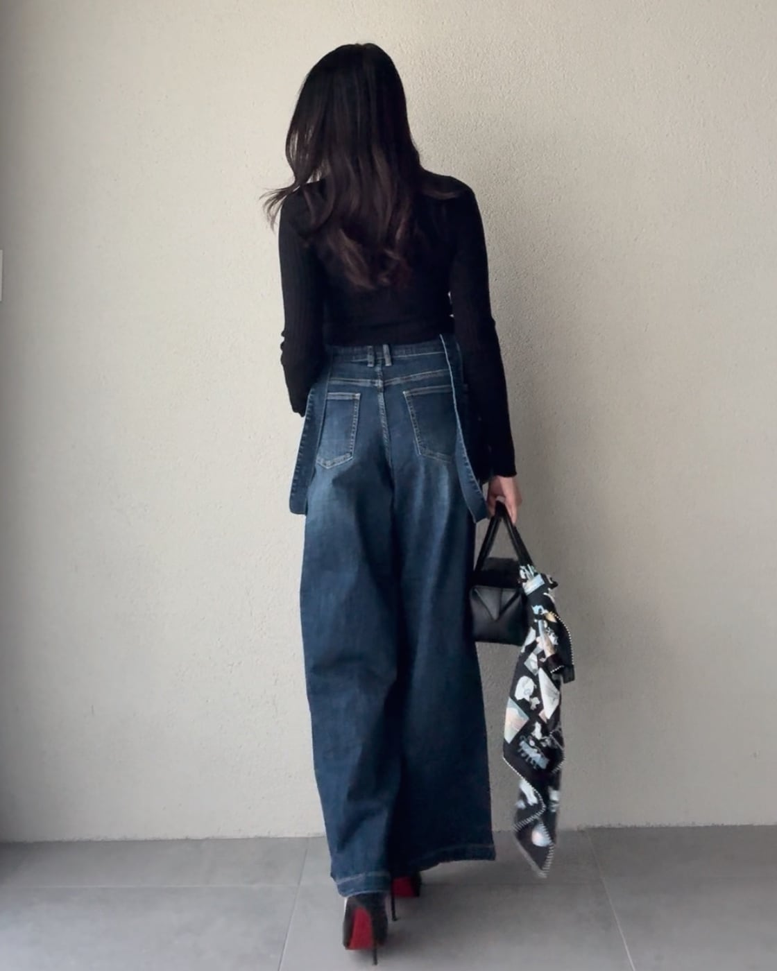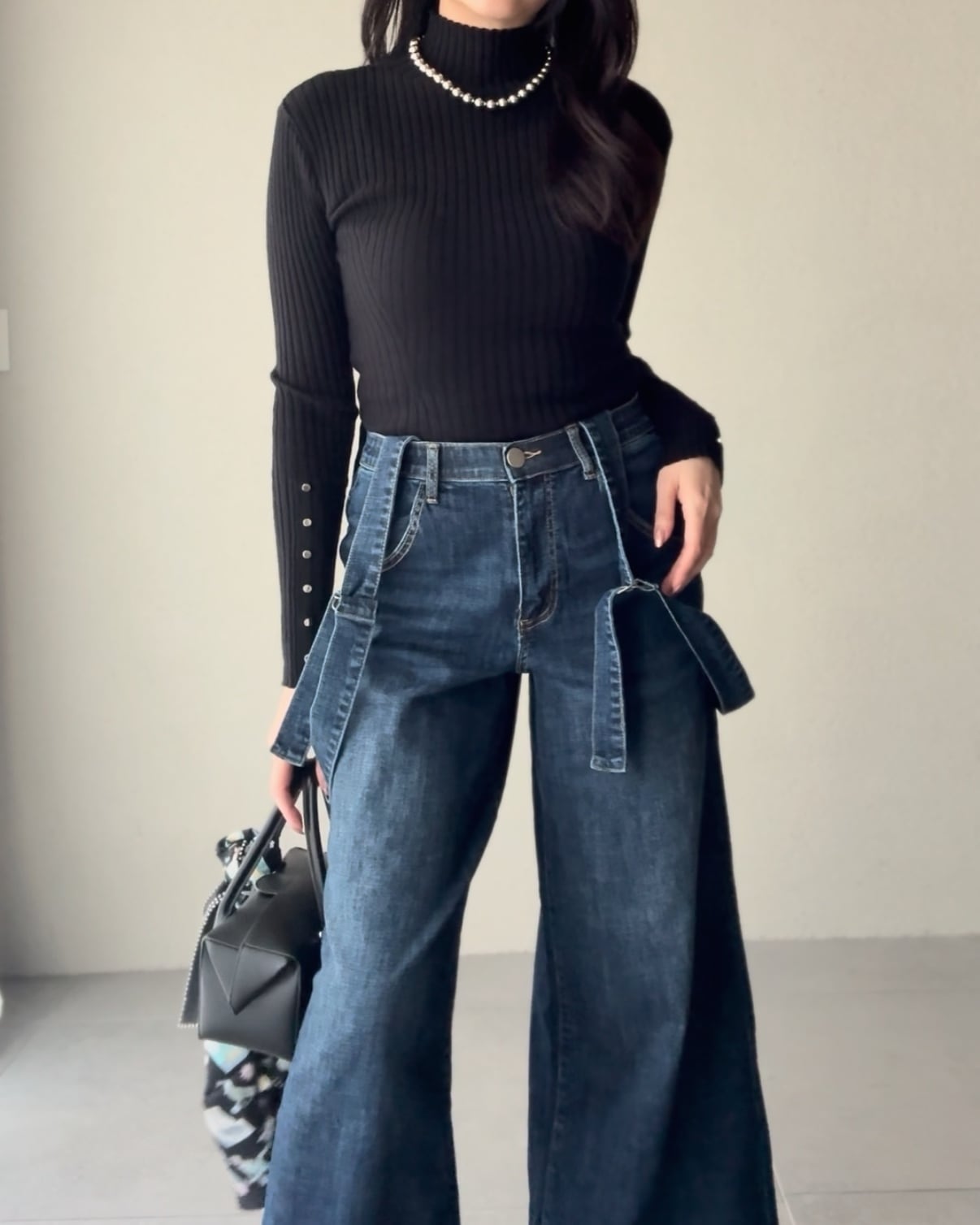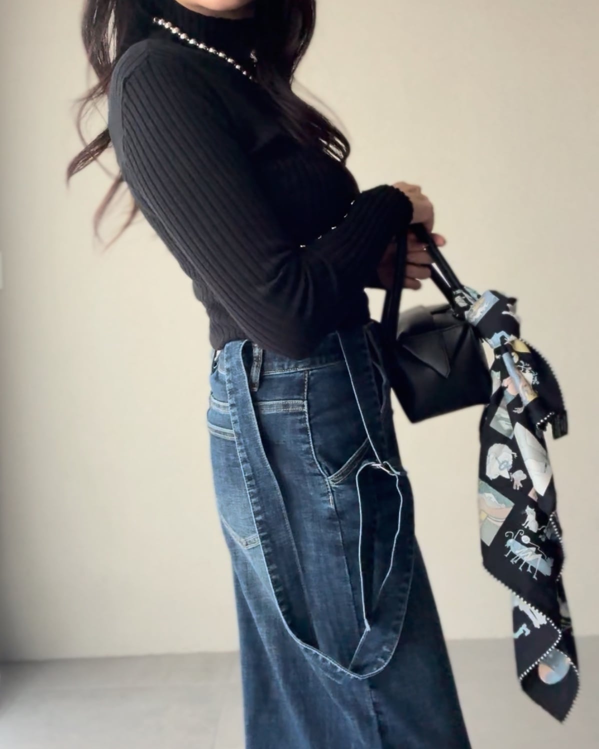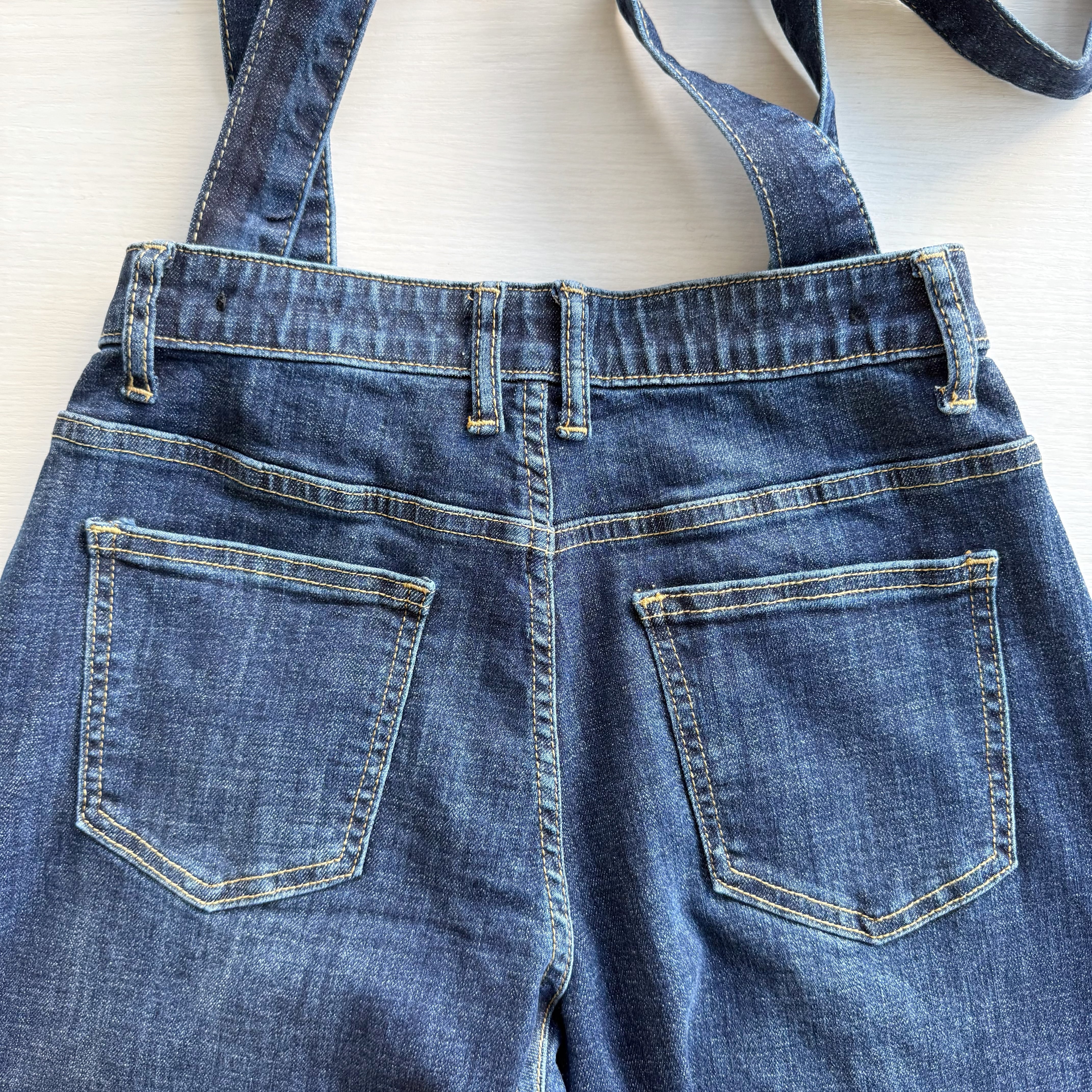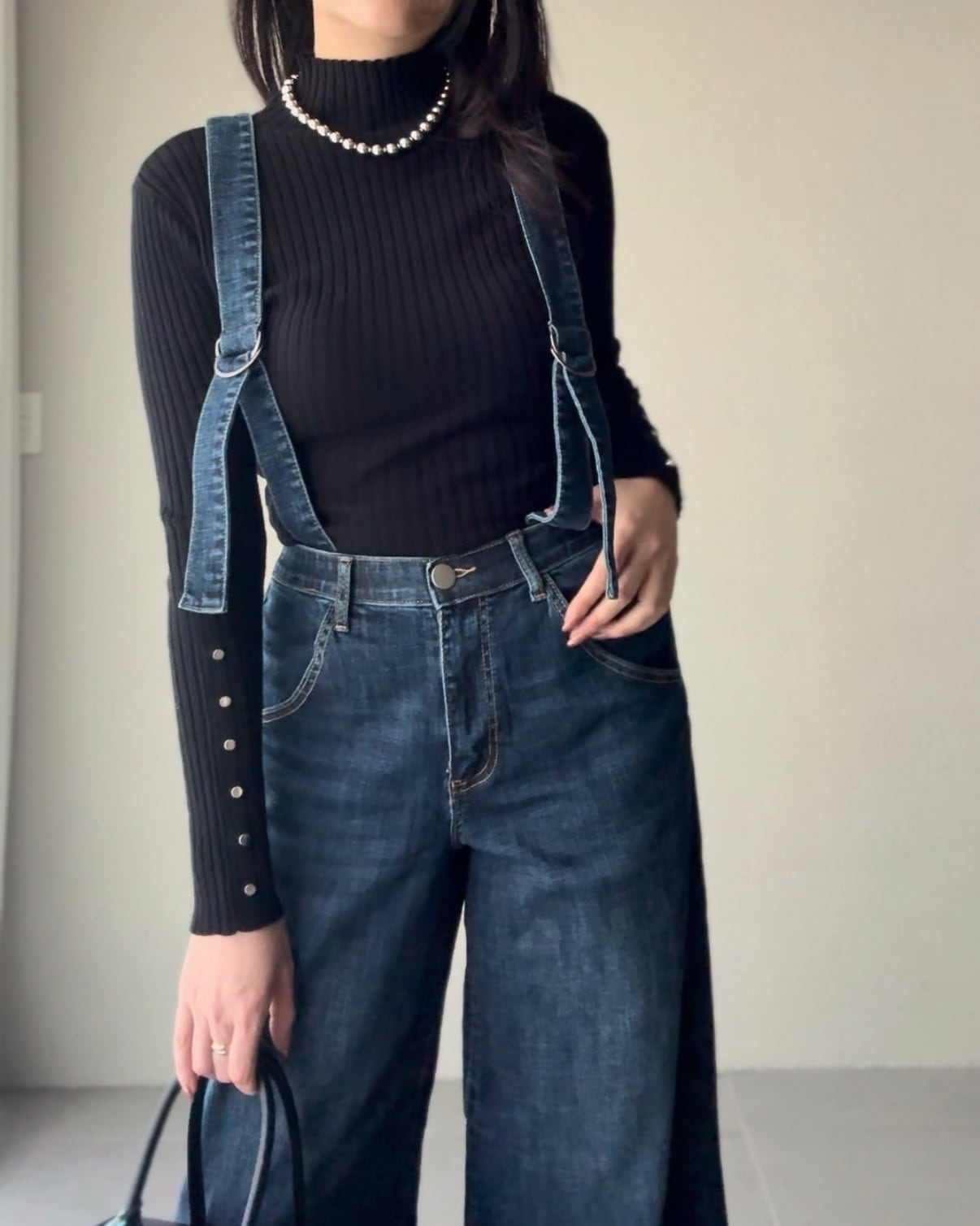 サスペンダーデニムパンツ。